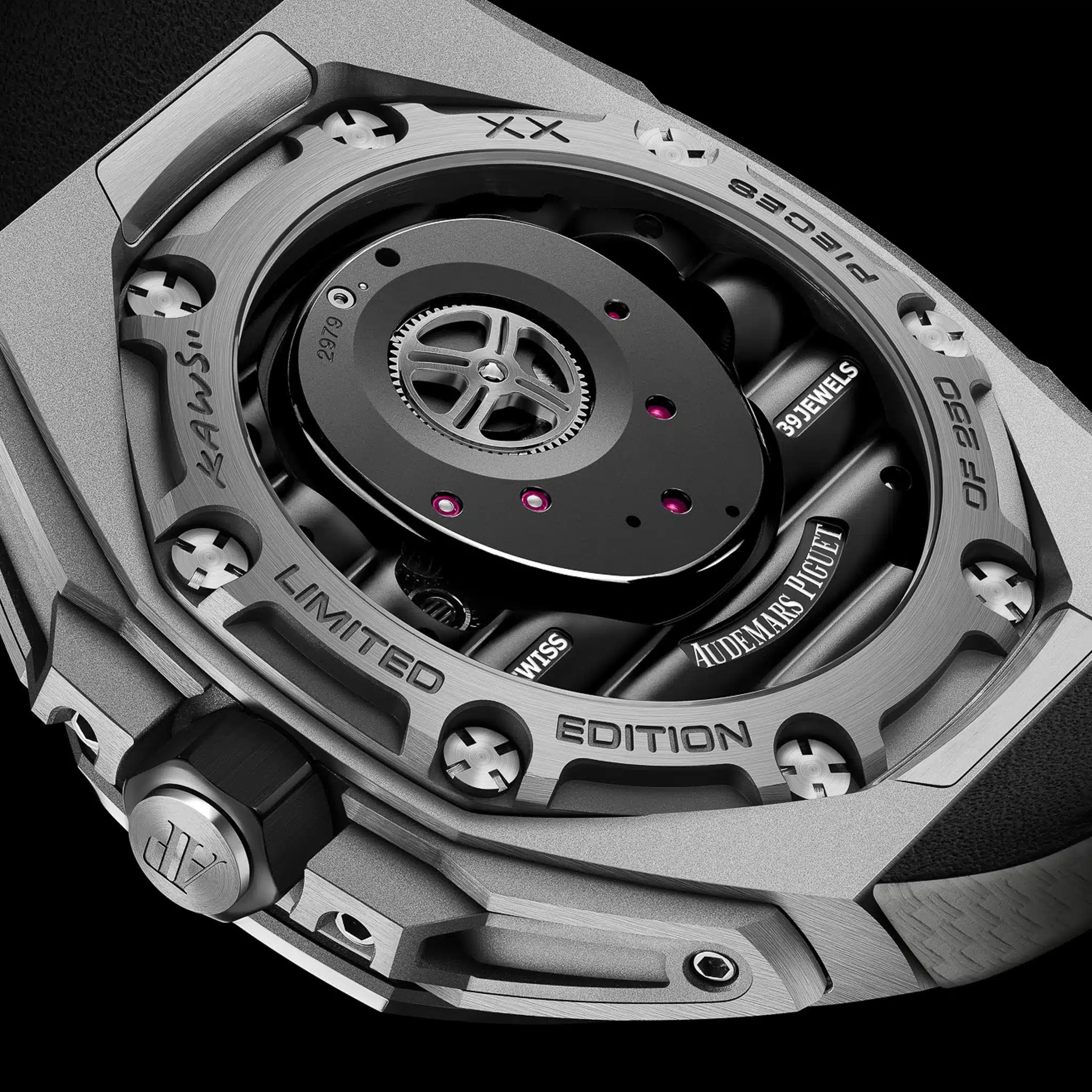 透過藍寶石水晶透明錶背可細賞這全新機芯的創新結構,黑色PVD塗層金屬齒輪系橋板的開放式造型讓棘輪得以顯現,其作用是為發條軸上鍊,上面刻有KAWS的經典 “XX”標誌。12 點鐘位置可見一枚掣子,用以防止齒輪逆向旋轉。黑色橋板與 “Swiss”、”39 jewels”字樣和 “Audemars Piguet”標誌形成鮮明對比,全均以鐳射雕刻並塗上白色亮漆。