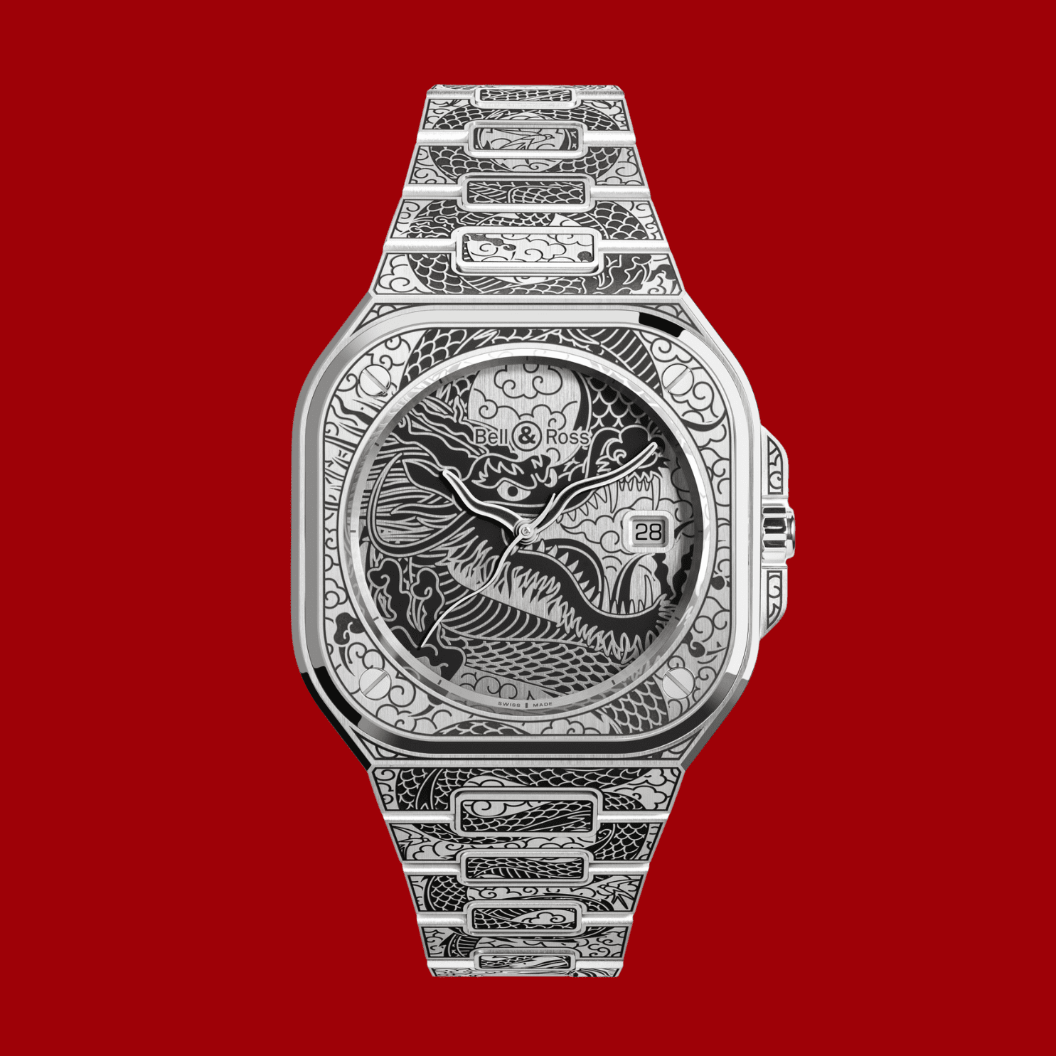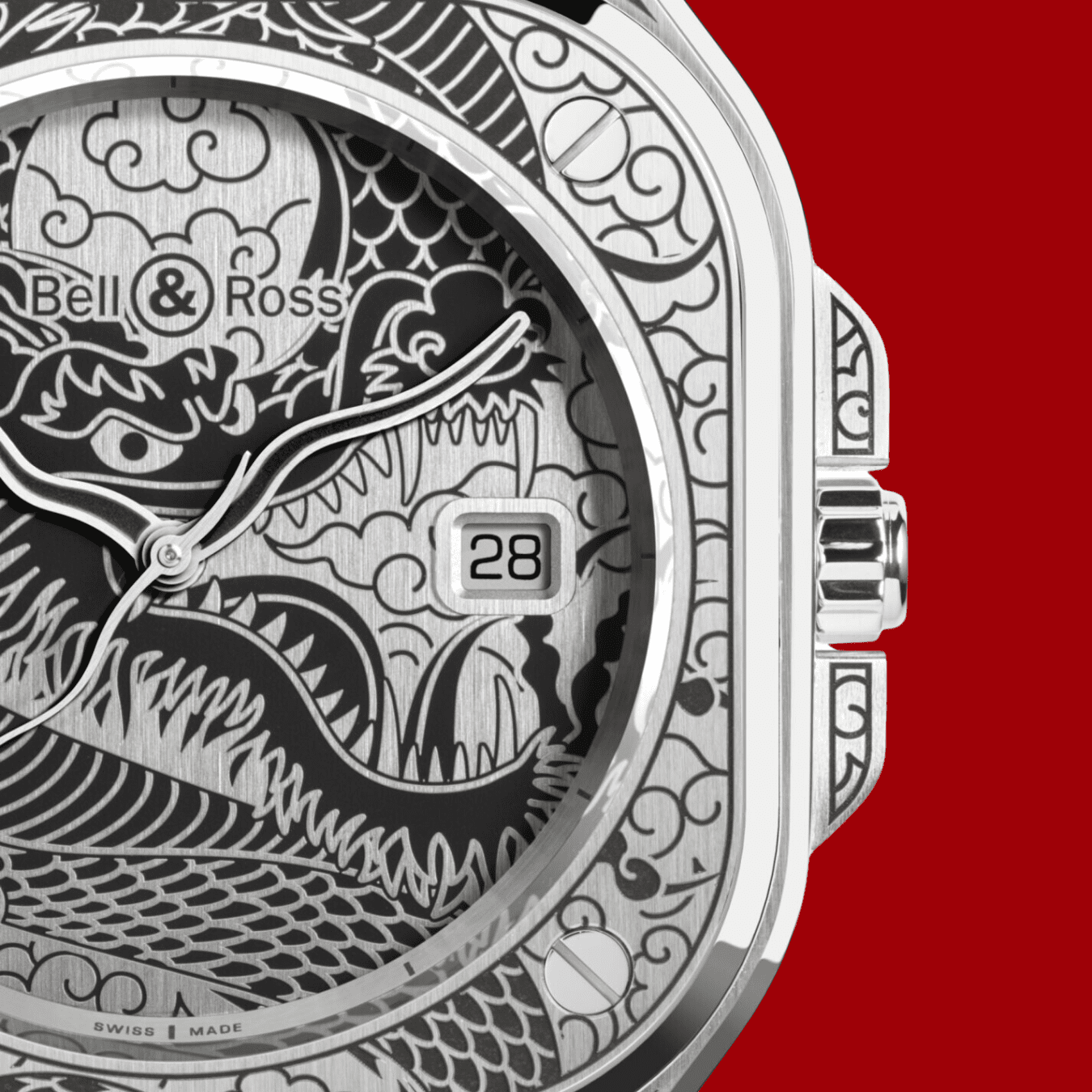 Bell & Ross選擇以BR 05系列作為創作基礎,原因顯而易見,因錶殼富有充裕的空間展現精湛工藝。新作將BR 05系列的優雅美學與龍的複雜細節結合,以不銹鋼材質打造40mm錶殼,採用刺青藝術的風格,利用雷射雕刻的方式,在整枚腕錶上刻滿龍的圖案。