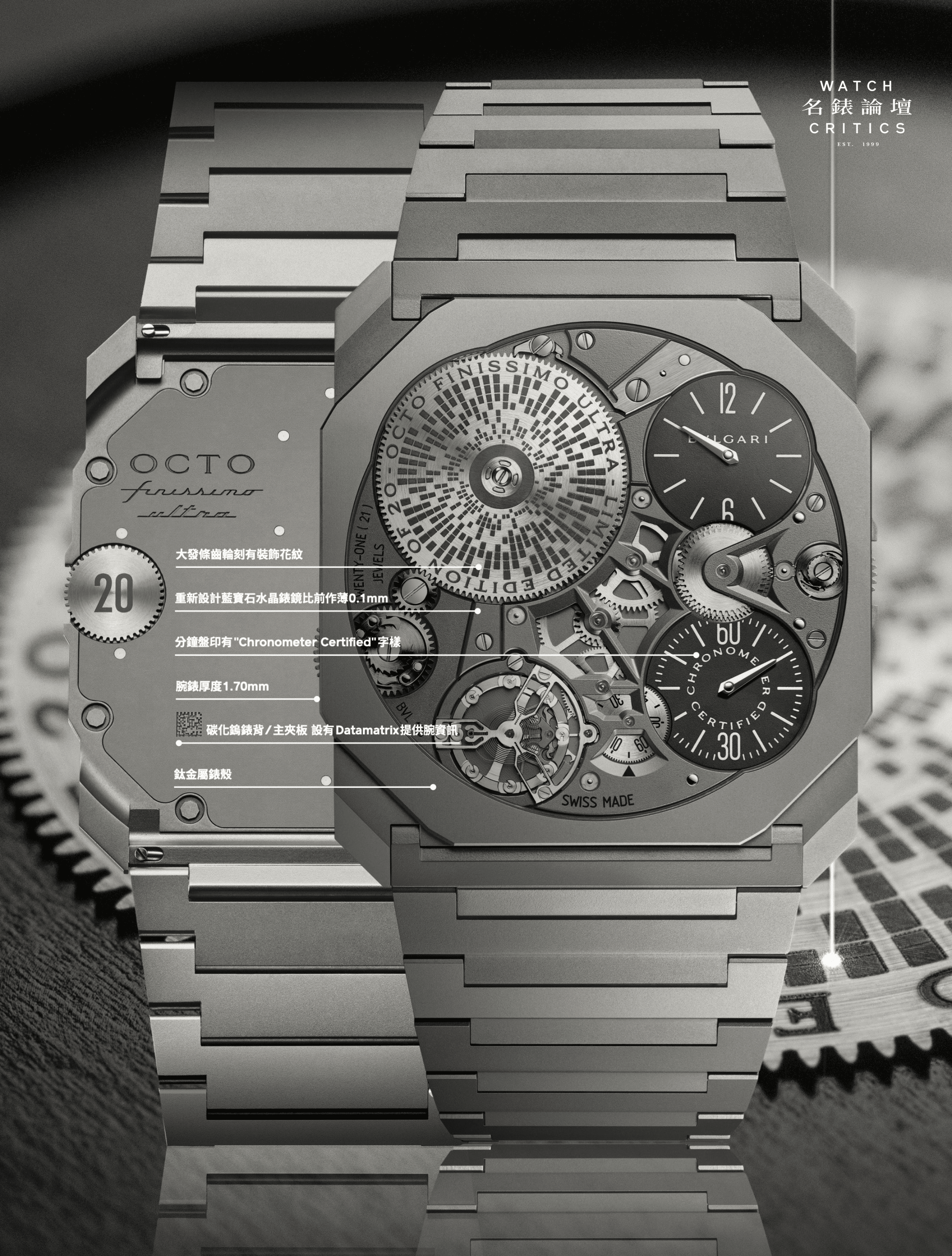 Octo Finissimo Ultra COSC另一重大突破是獲得COSC瑞士天文台認證,保證腕錶的精確度。需知道高級鐘錶品牌的複雜腕錶及超薄腕錶多的是,然而能做出高精準度的則少之又少,因此今次Ultra COSC可榮獲COSC認證絕對是超薄腕錶、以至是複雜腕錶的重要里程碑,也同時創下最薄COSC腕錶的另一個紀錄,所以Ultra COSC是一枚雙重超薄紀錄腕錶。要達到這高精準度,安裝於BVL 180手動上鍊機芯的170枚零件均由十分之一微米的光學測量系統精選而出,以確保零件尺寸大小能符合完美要求,藉以超越傳統生產技術的侷限與框架,展現對精確度的極致追求。機芯部件分為多個小型「模組」來緊密監察每個小組的運作表現,如有個別組件有偏差即作出調整,或由其他模組作互補,經反覆又反覆的測試,過程極度繁複。腕錶限量20枚,每一枚腕錶均送往COSC作為期15天的測試,包括5個不同位置及3種不同溫度等。錶迷們也知道一般20mm直徑以上腕錶的COSC標準是-4/+6,由於Ultra COSC的機芯體積比20mm直徑以下的機芯還要小,所以其COSC的每日誤差標準比一般的略多。每枚腕錶附有一張COSC證書,4時至6時位的分鐘盤也印有Chronometer Certified字樣。