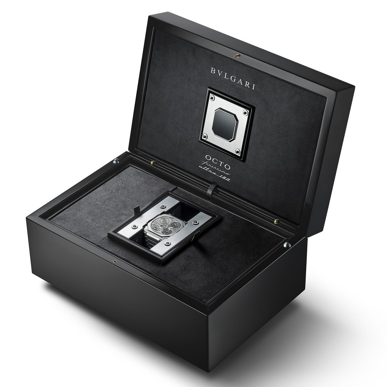 標誌性的QR Code發條盒現改為刻上裝飾花紋,並改於在錶背左下方設有迷你Datamatrix連動腕錶相關資訊,透過圖片與影像,可深入瞭解Octo Finissimo Ultra COSC超薄瑞士天文台認證腕錶對於極致精巧、特殊工藝,以及獨創美學的不懈追求。附送為腕錶特別設計的專用錶盒,內設上鍊及調校功能的數位顯示器,只要輕觸按鈕,就能輕鬆設定時間,啟動調校週期,數秒內即能達成完美調校。當然喜歡每天為腕錶上鍊的收藏家,也可繼續以傳統手動方式為腕錶注入能量,為機芯貯能50小時。
