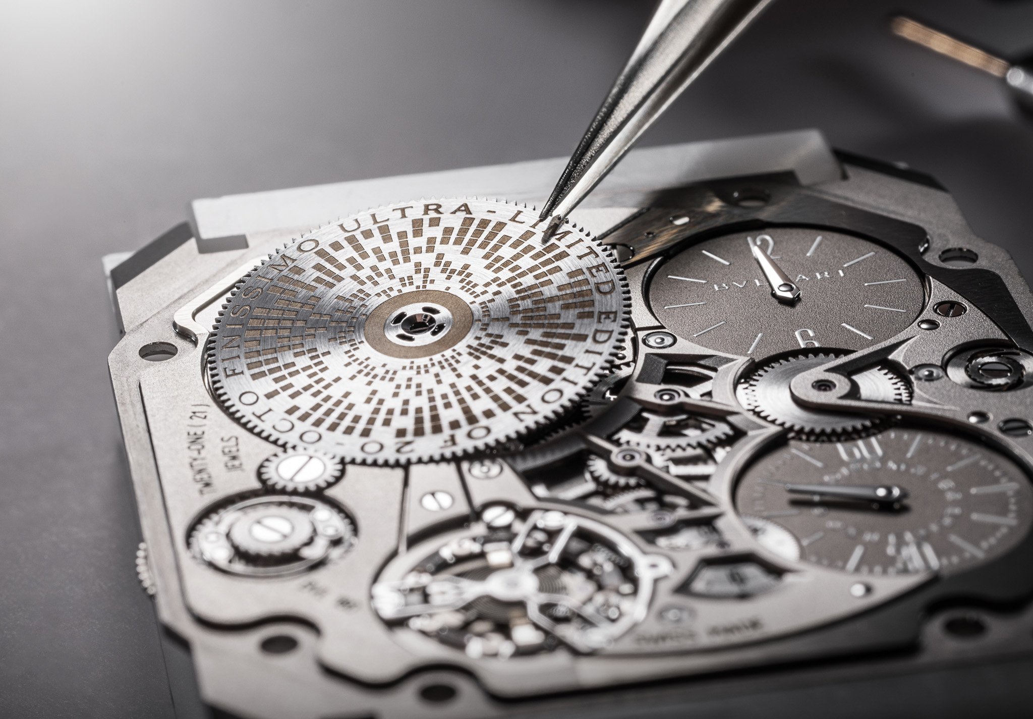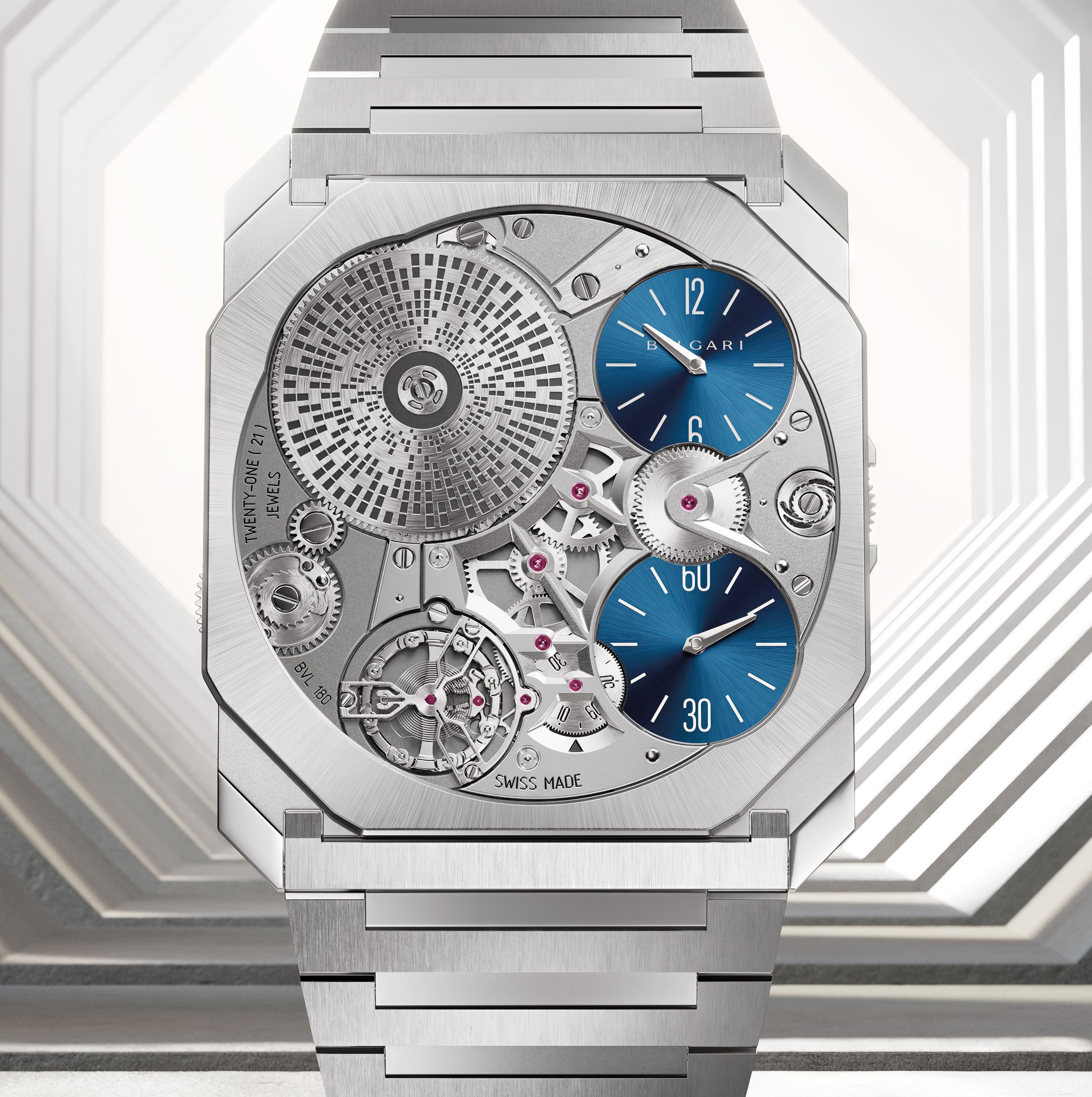 今年Octo Finissimo Ultra不只在超薄腕錶厚度及精準度創下新紀錄,在物料上也作出重要突破,推出全新鉑金版本。Octo Finissimo Ultra Platinum鉑金版跟之前的鈦金屬版一樣厚1.80mm,堪稱是「全球最薄鉑金機械腕錶」,因此嚴格來說BVLGARI這次是一口氣創出三個超薄腕錶的新世界紀錄!鉑金密度高因此加工難度極高,加上纖薄尺寸要求極高精確度,為製作這枚鉑金超薄腕錶大大增添難度。錶匠還細心為鉑金錶殼加入不同修飾,中層錶殼與錶圈經緞面拋光及噴砂處理,配以碳化鎢錶背/主夾板。緞面拋光錶帶同樣以鉑金製成,搭配鈦金屬一體式錶扣,經過5,000次循環測試,確保穩固可靠。兩個小時及分鐘小錶盤特別換上藍色放射紋飾面醒目有型,發條盒同樣改為刻紋裝飾,並於錶背設有Datamatrix提供腕錶資訊。