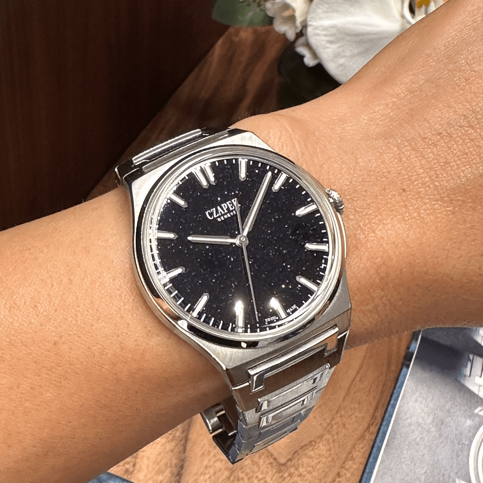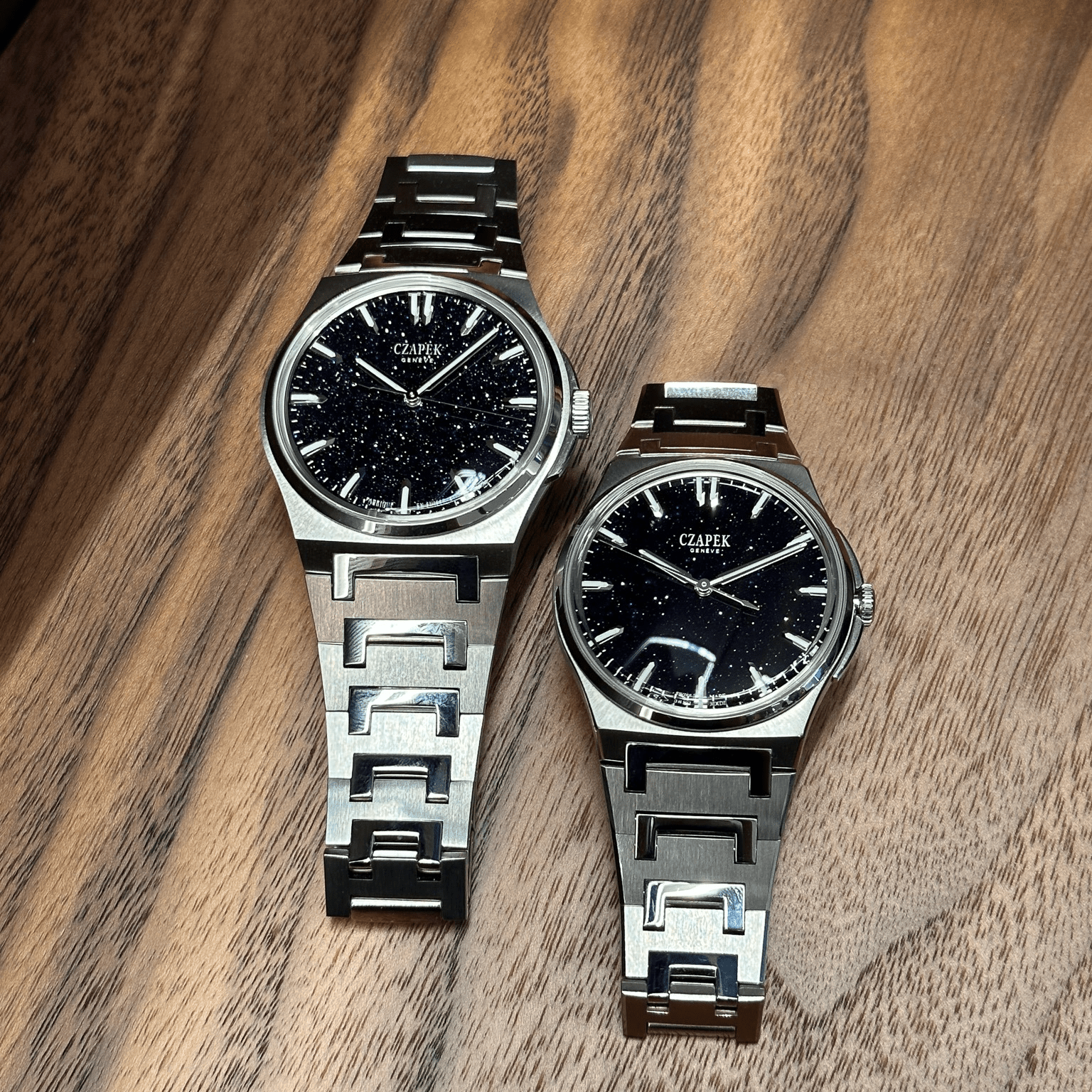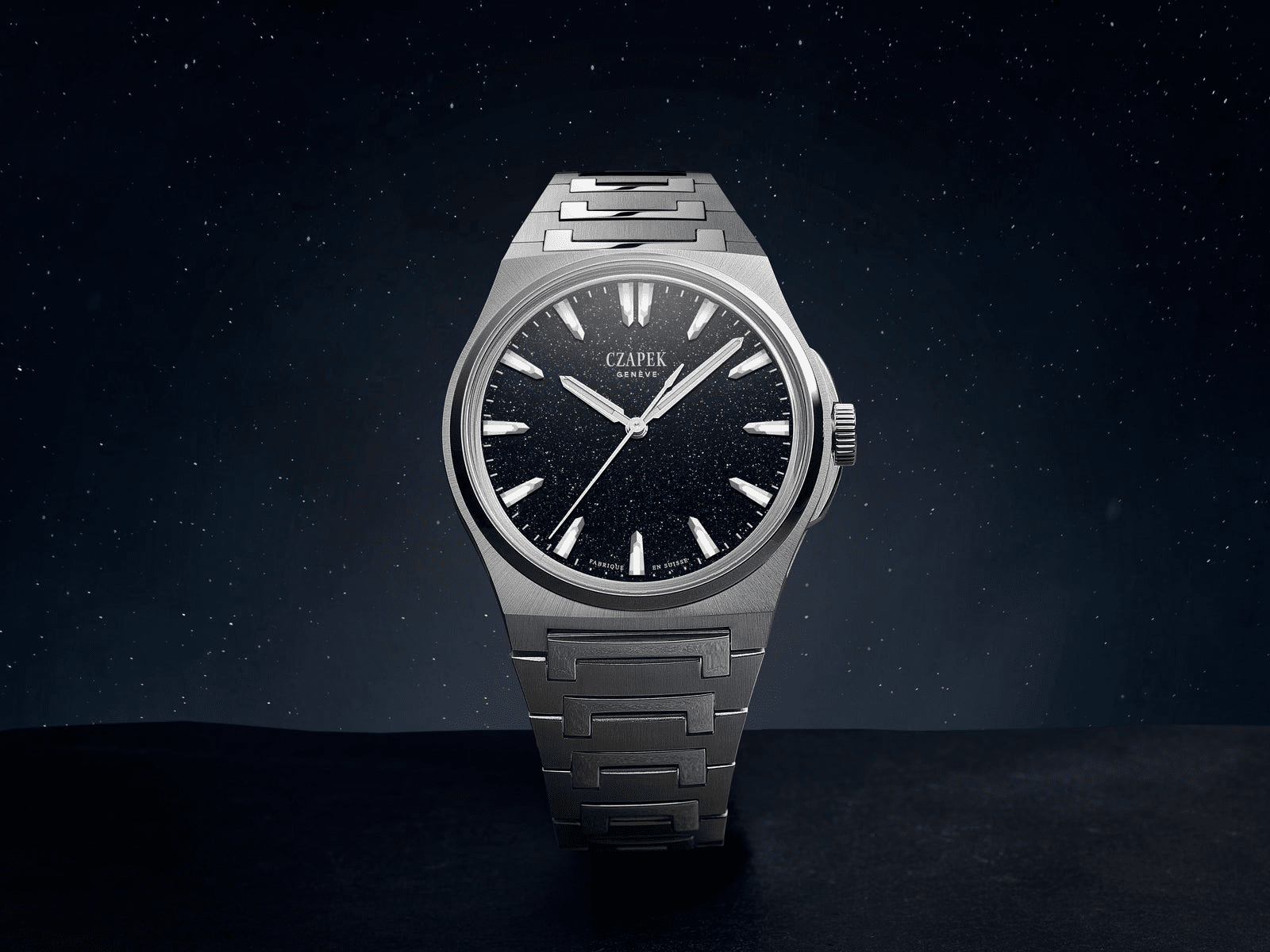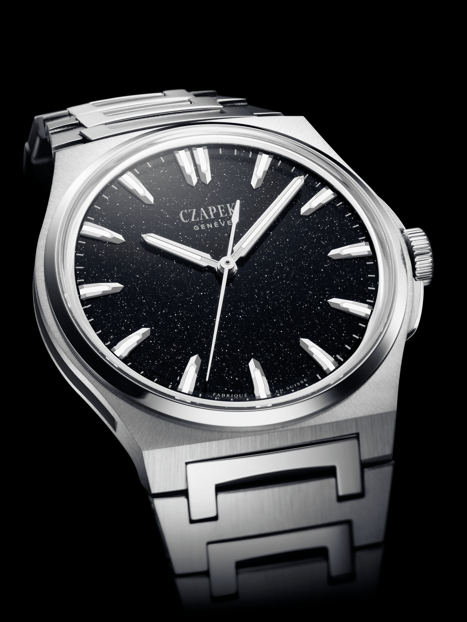 Czapek的代表作Antarctique自2020年面世後,錶盤已成為品牌的創作舞台,先後推出不同工藝圖案,或是將稀有寶石製作錶盤。今屆Geneva Watch Days 2024品牌繼續將錶盤作畫布,選用砂金石及鑽石將浪漫星空帶到錶盤上,設計全新Antarctique Polar Sky腕錶。