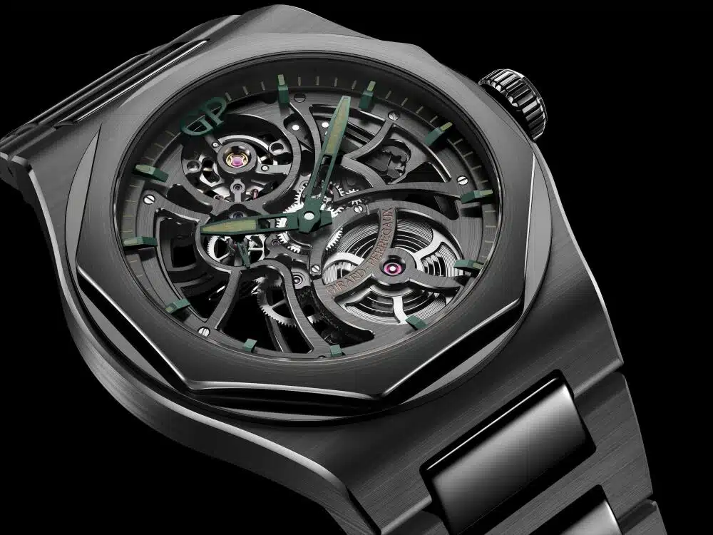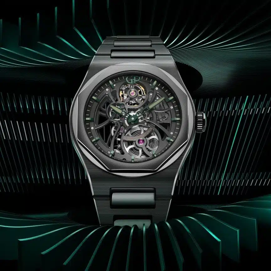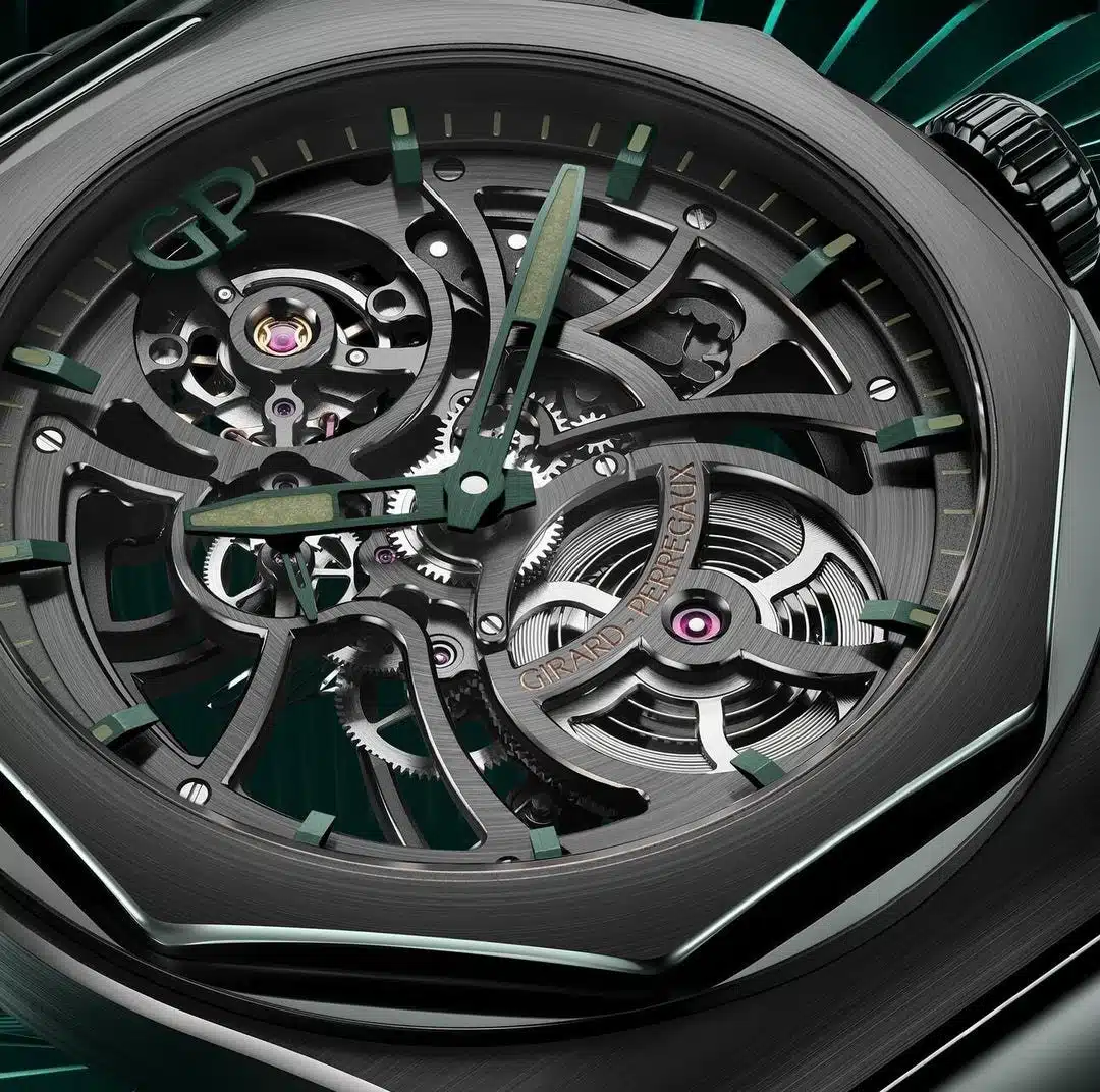 腕錶搭載品牌自製GP01800自動上鍊機芯,備有54小時動力貯存,配備無卡度擺輪系統,擁有出色的穩定性與抗震性能。鏤空實金擺陀同樣以賽車綠點綴,與整體配色呼應。參考價為HK$428,000。