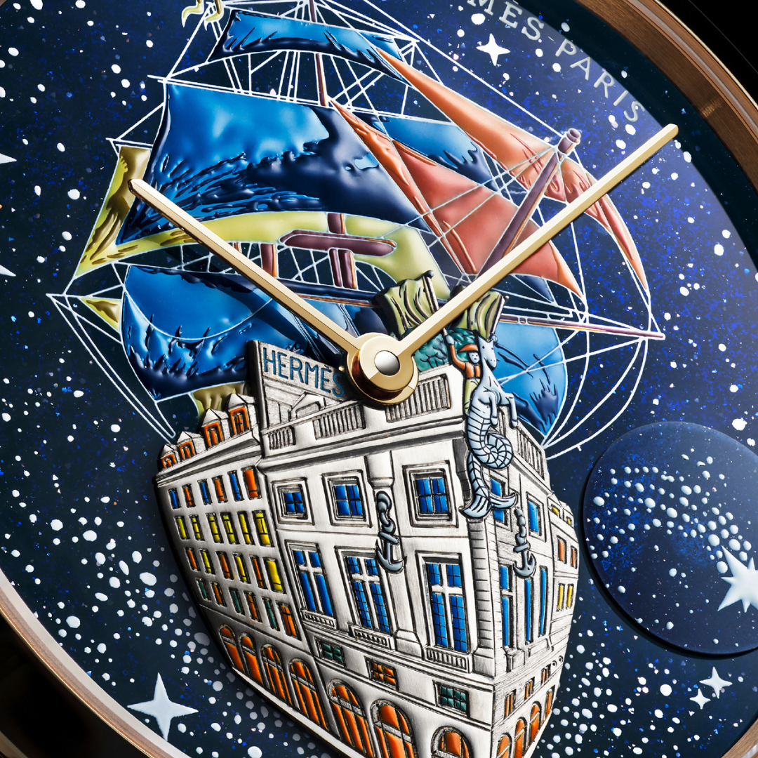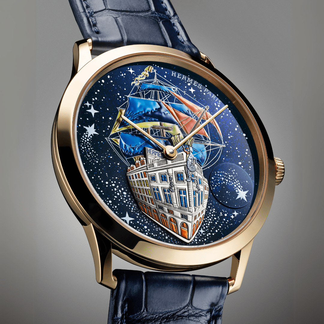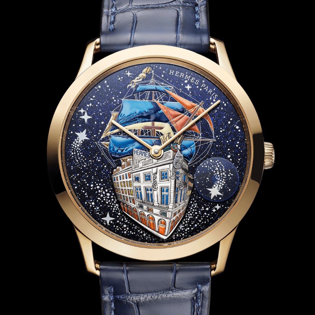 全新Slim d’Hermès Flagship工藝腕錶,靈感來自Dimitri Rybaltchenko設計的同名絲巾作品,錶盤飾有一艘在洶湧流星雨夜空中航行的巨型船艦。