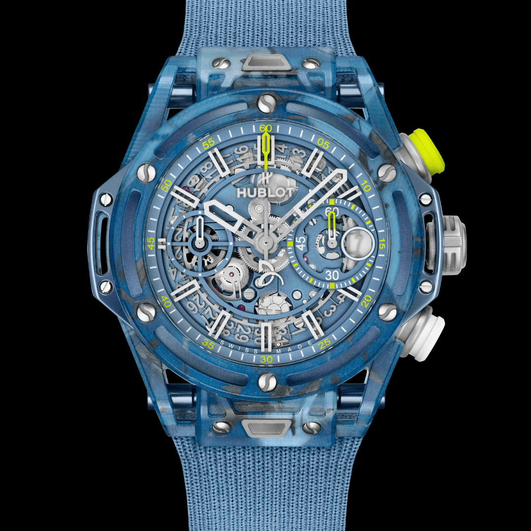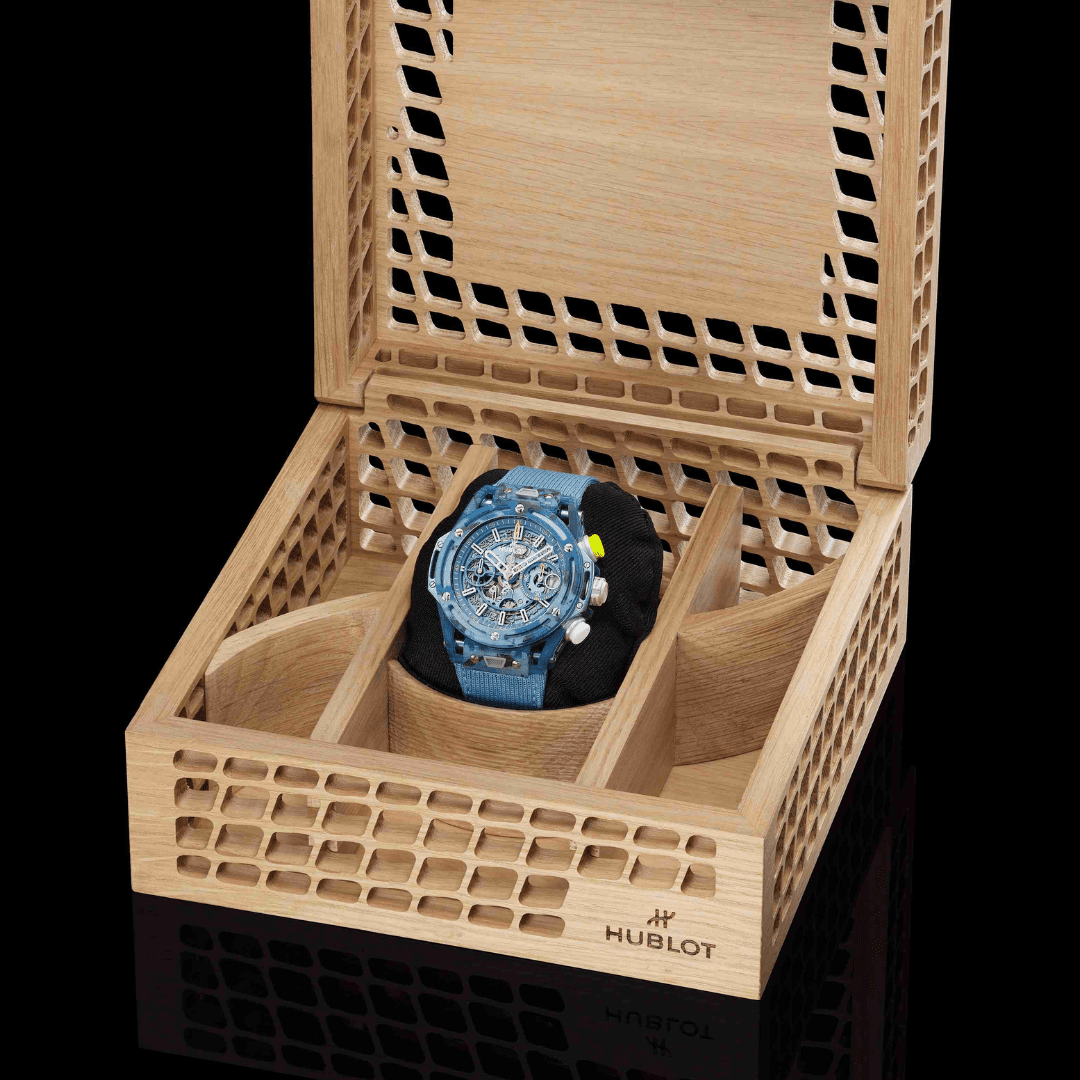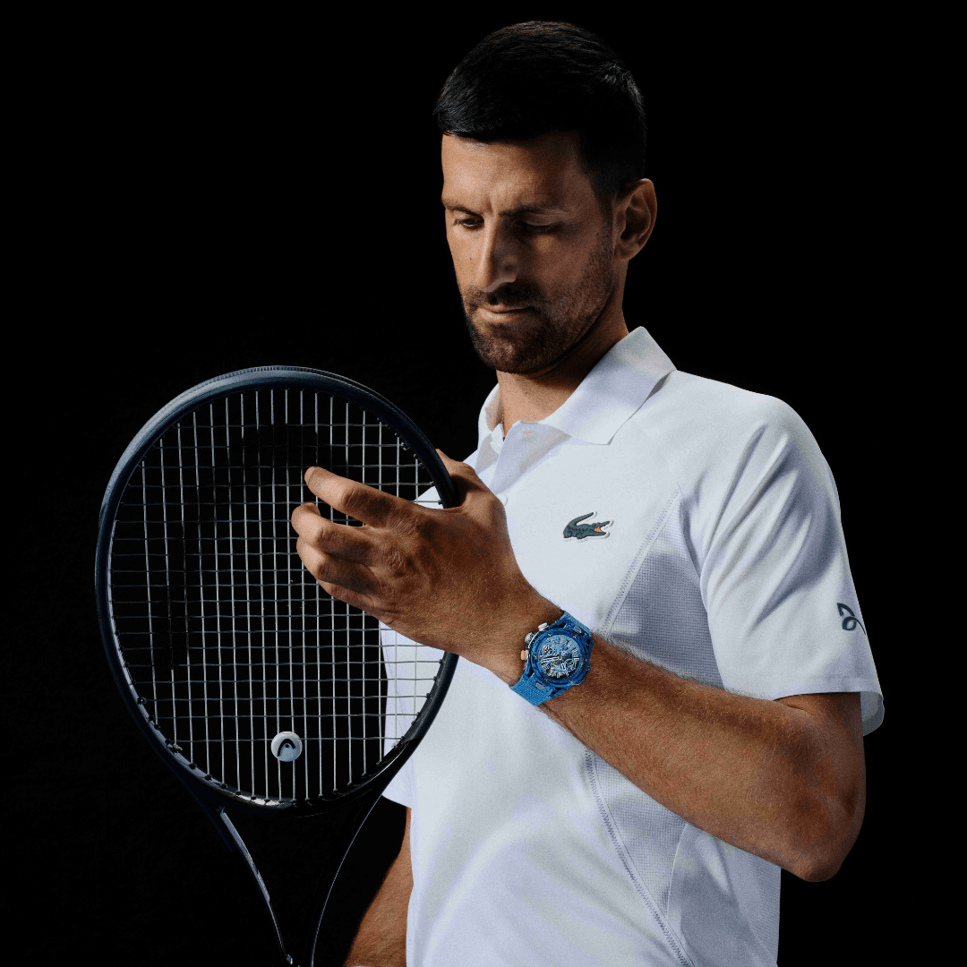 全新Big Bang Unico Novak Djokovic,錶徑42mm的天藍色啞光錶殼和錶圈,採用祖高域打破紀錄的2023賽季中,所使用的25支HEAD球拍及他身穿的32件藍色Lacoste Polo衫再生而成的複合材料,並結合環氧樹脂、石英粉和玻璃纖維,為腕錶帶來深淺不一的藍色迷彩紋理,獨特搶眼。