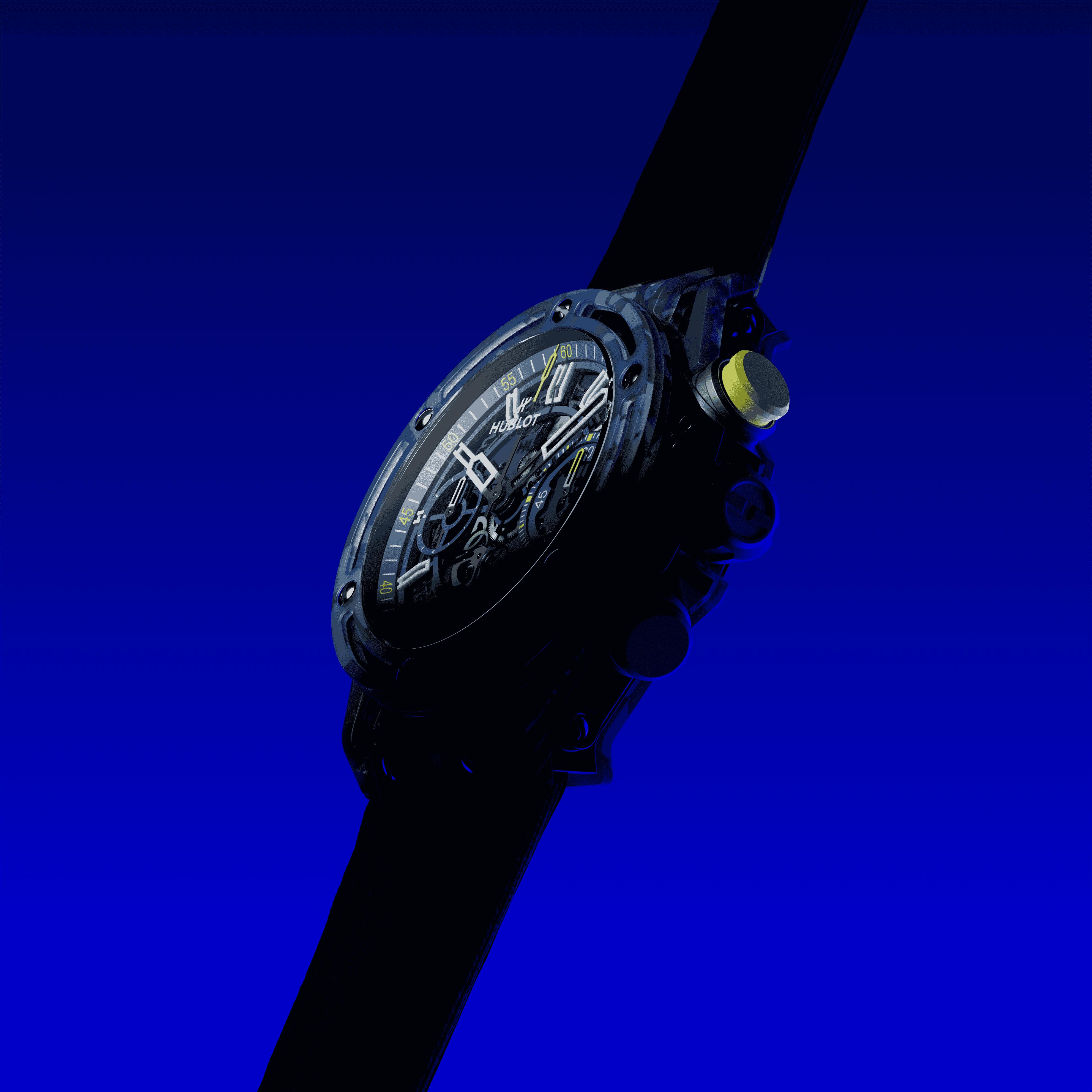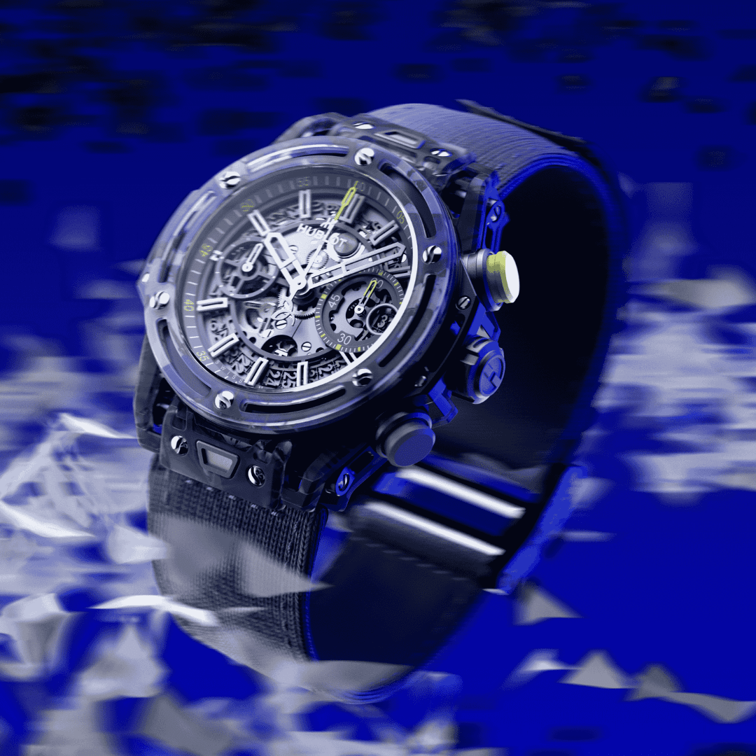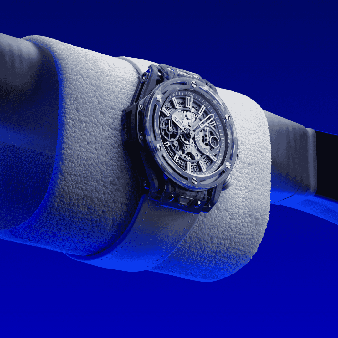 全新Big Bang Unico Novak Djokovic,錶徑42mm的天藍色啞光錶殼和錶圈,採用祖高域打破紀錄的2023賽季中,所使用的25支HEAD球拍及他身穿的32件藍色Lacoste Polo衫再生而成的複合材料,並結合環氧樹脂、石英粉和玻璃纖維,為腕錶帶來深淺不一的藍色迷彩紋理,獨特搶眼。