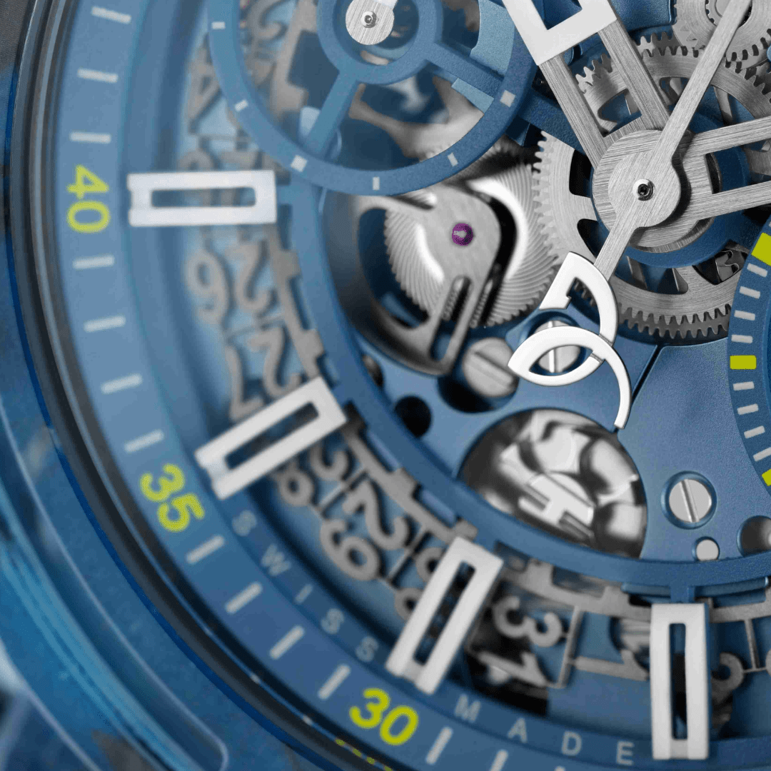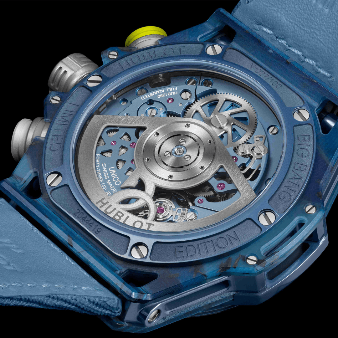 為了減輕腕錶的重量,內搭的HUB1280自動上鍊機芯,採用鋁製材質重新設計,使重量減輕了27%,提供72小時動力貯存,同時經過淺藍色或灰色陽極氧化處理,呈現出與錶殼匹配的迷彩配色,性能與美感兼備。