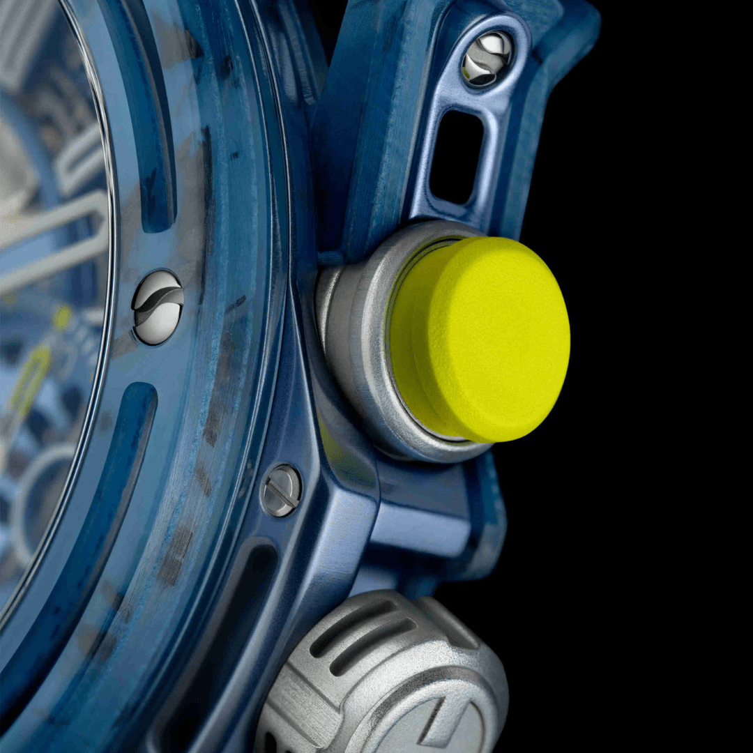 鏤空錶盤充滿層次感,搭配白色螢光時標及鏤空指針,與錶面的黃色細節及黃色計時按鈕相映成趣,同時呼應網球元素。