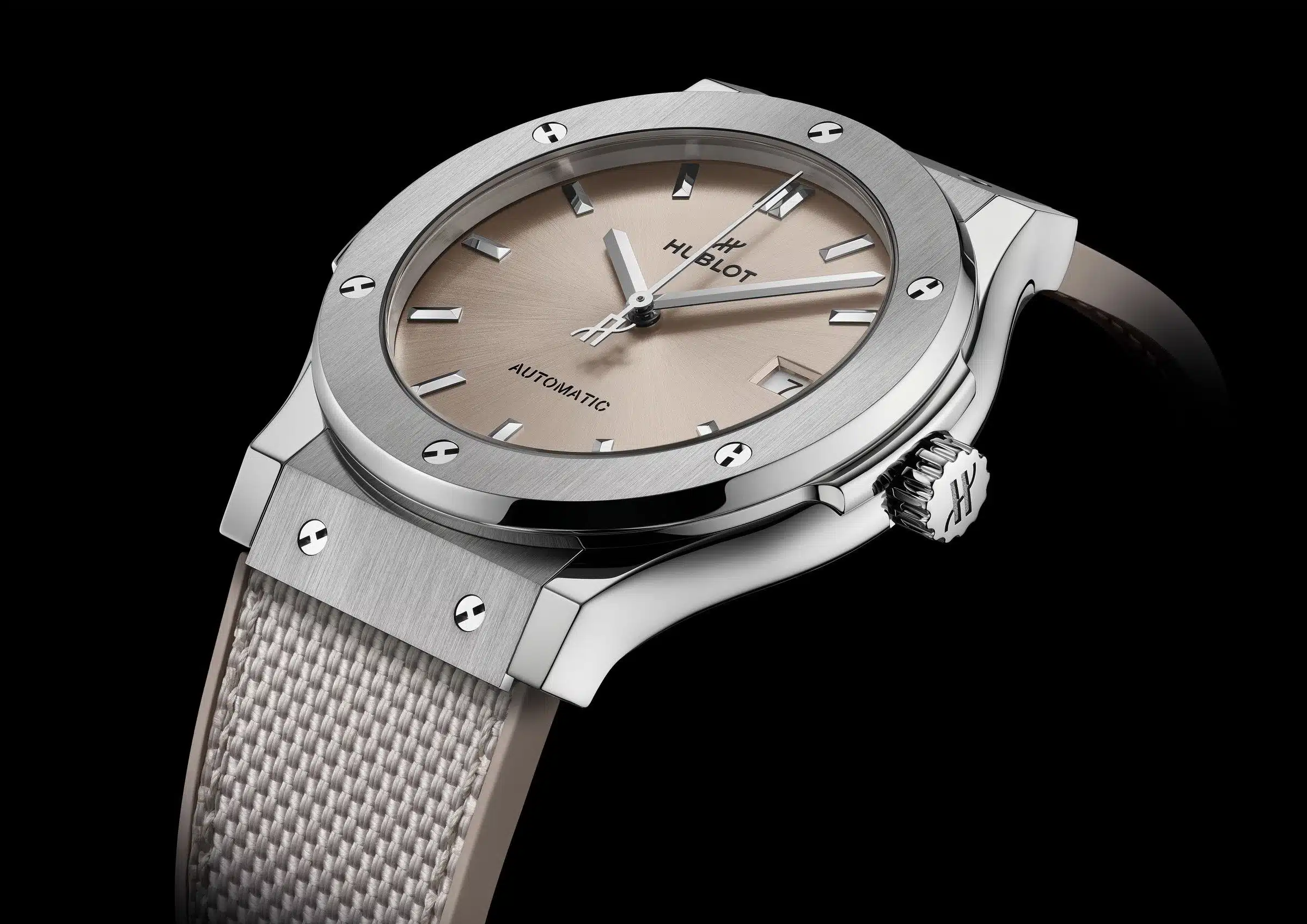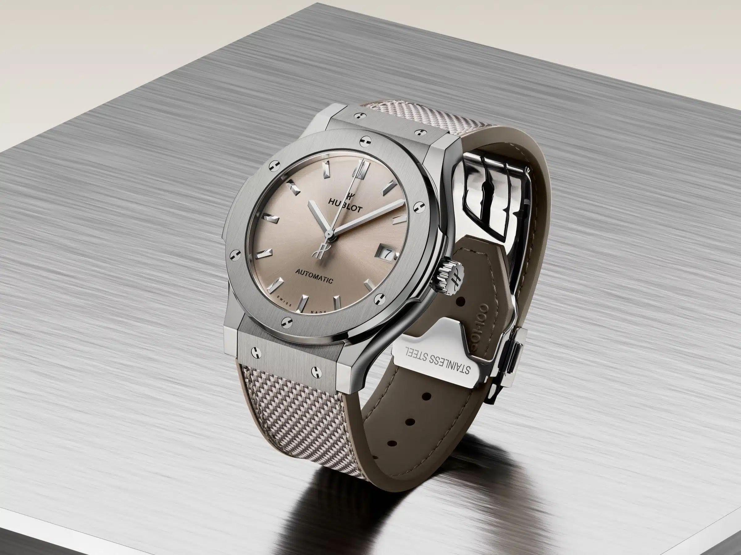 Hublot繼此前以鈦金屬錶殼搭配銀灰色面推出三枚Essential Grey腕錶後,品牌近日為這個單色系列換上灰裡帶棕的灰褐新色,搭配冷冽的鈦金屬錶殼,及獨特的橡膠與織物混合錶帶,一口氣推出42mm及45mm兩個型號,低調典雅。