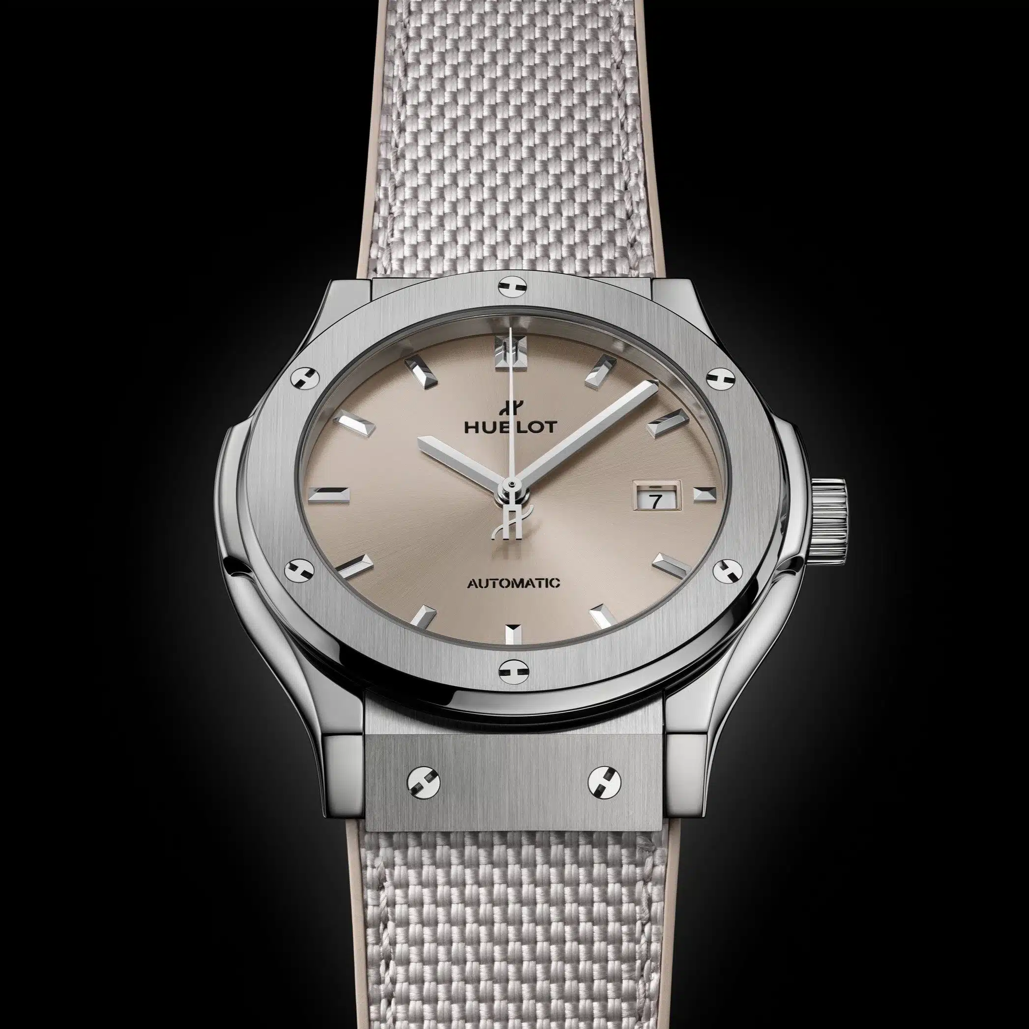 繼此前以鈦金屬錶殼搭配銀灰色面推出Essential單色系列,先後發佈Big Bang Unico、Spirit of Big Bang及Classic Fusion Essential Grey款式後,Hublot今年再下一城推出同樣採用鈦金錶殼、錶盤和鏈帶卻換上灰褐新色的Classic Fusion Essential Taupe,開啟第四篇章。冷冽的鈦金屬錶殼在灰裡帶棕的灰褐色(有點像亞麻色)襯托下,頓時變得柔和一些,男女皆宜。