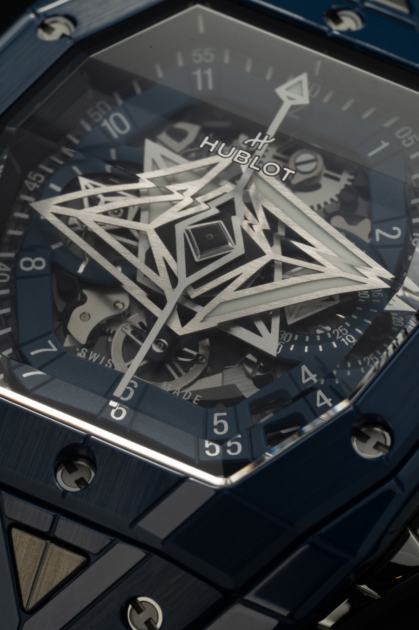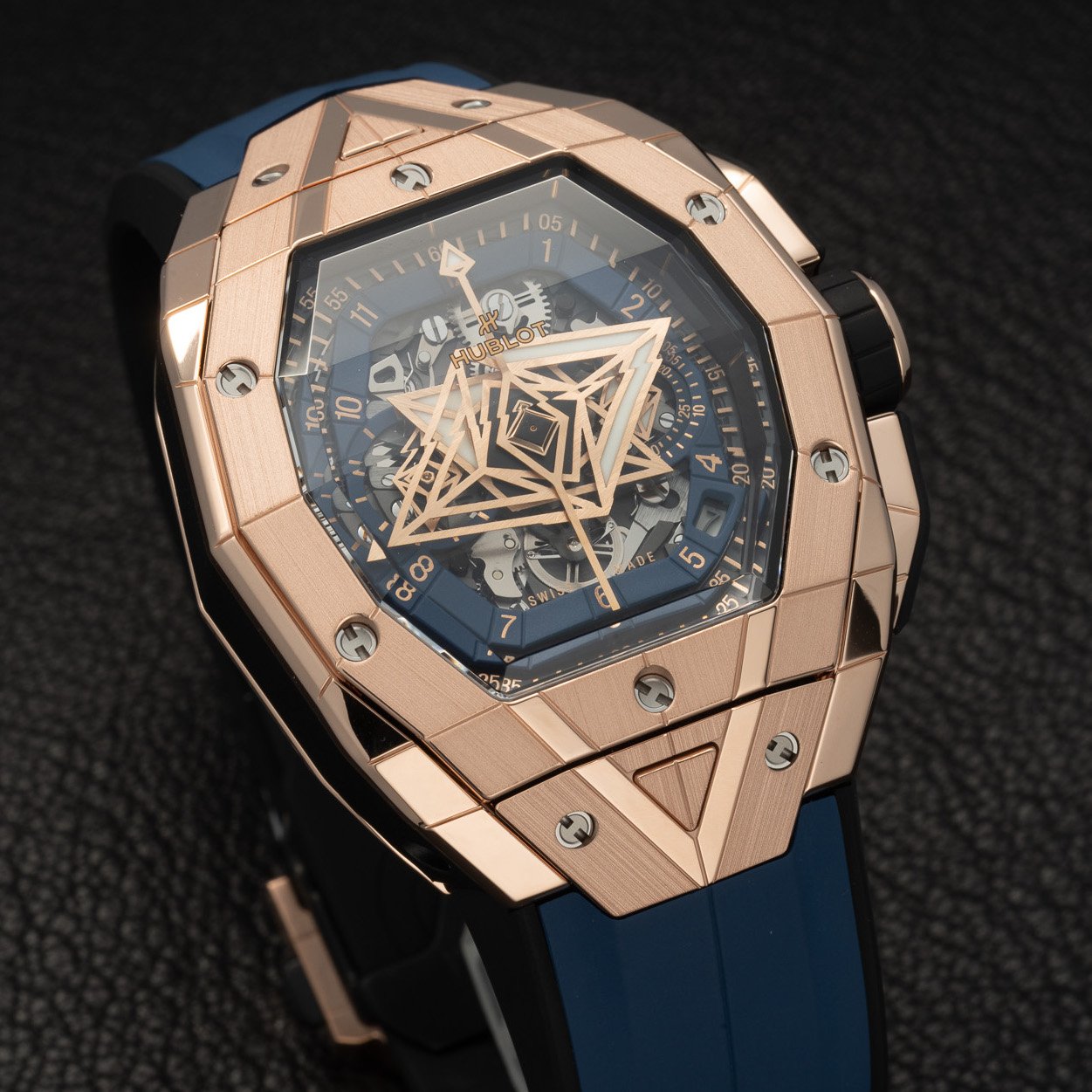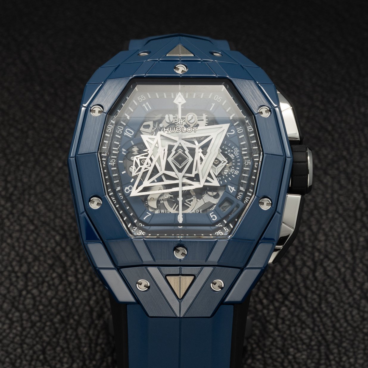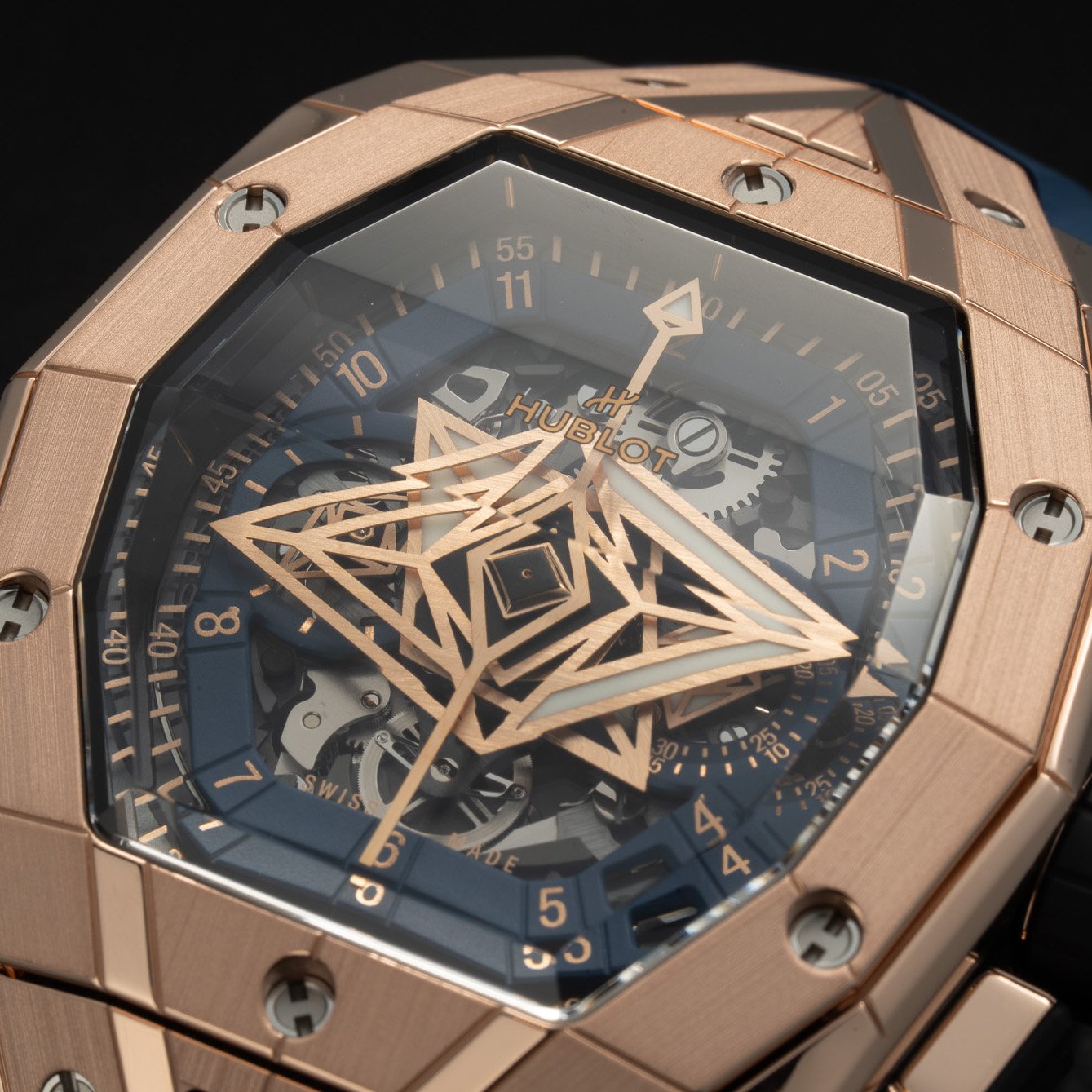 錶盤佈局亦延續系列的鏤空幾何風格,並於4時半位置設有日曆窗。藍色陶瓷款採用白色銠金指針,搭配藍色計時盤和時標,形成鮮明對比。而King Gold款則配備金色鍍層指針,數字刻度及中央位置的骨架亦抹上相同色調,與錶殼相得益彰。兩款腕錶均搭載HUB4700自動上鍊機芯,提供50小時動力貯存,同時配備硅質調節元件,更為精準穩定。