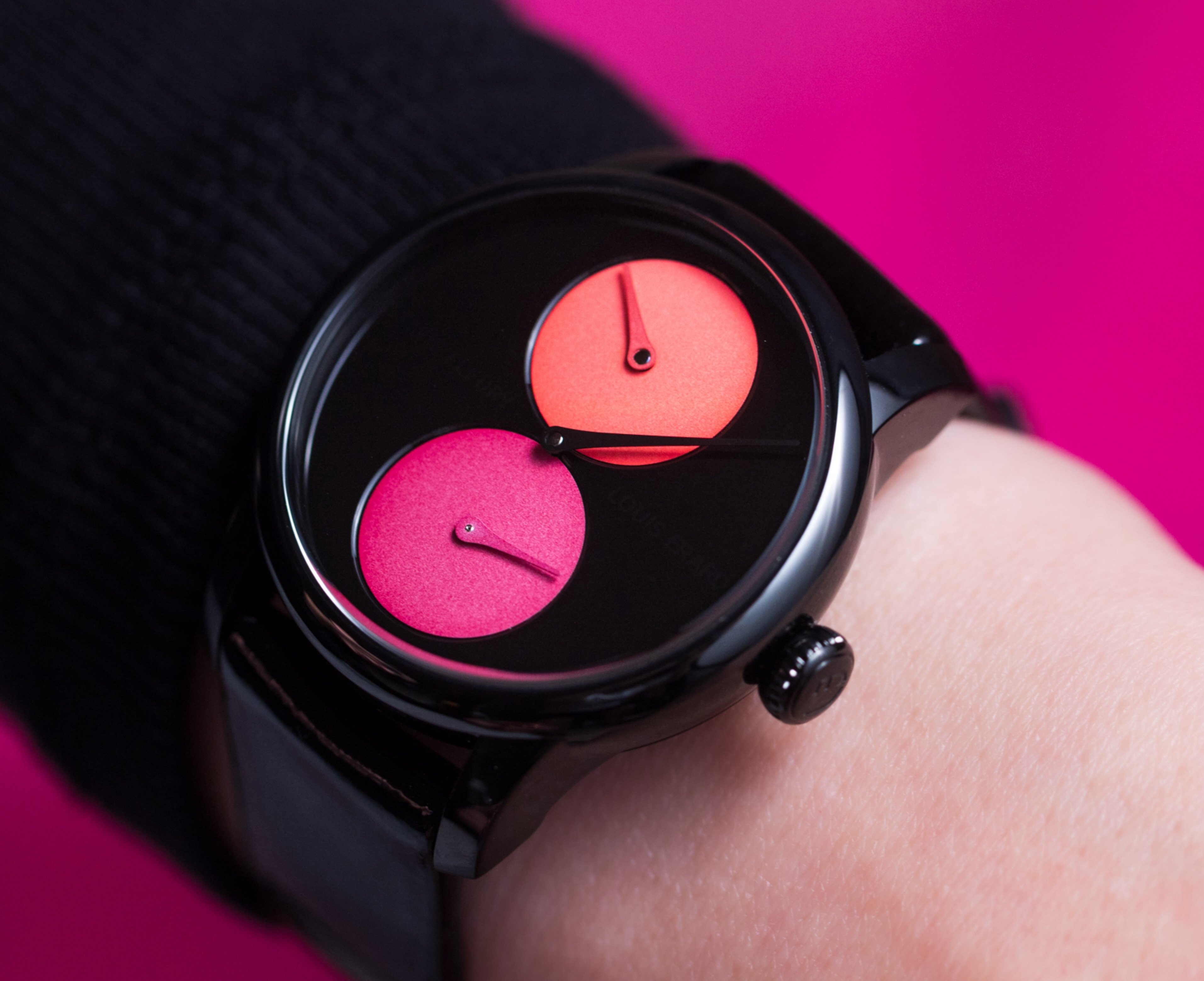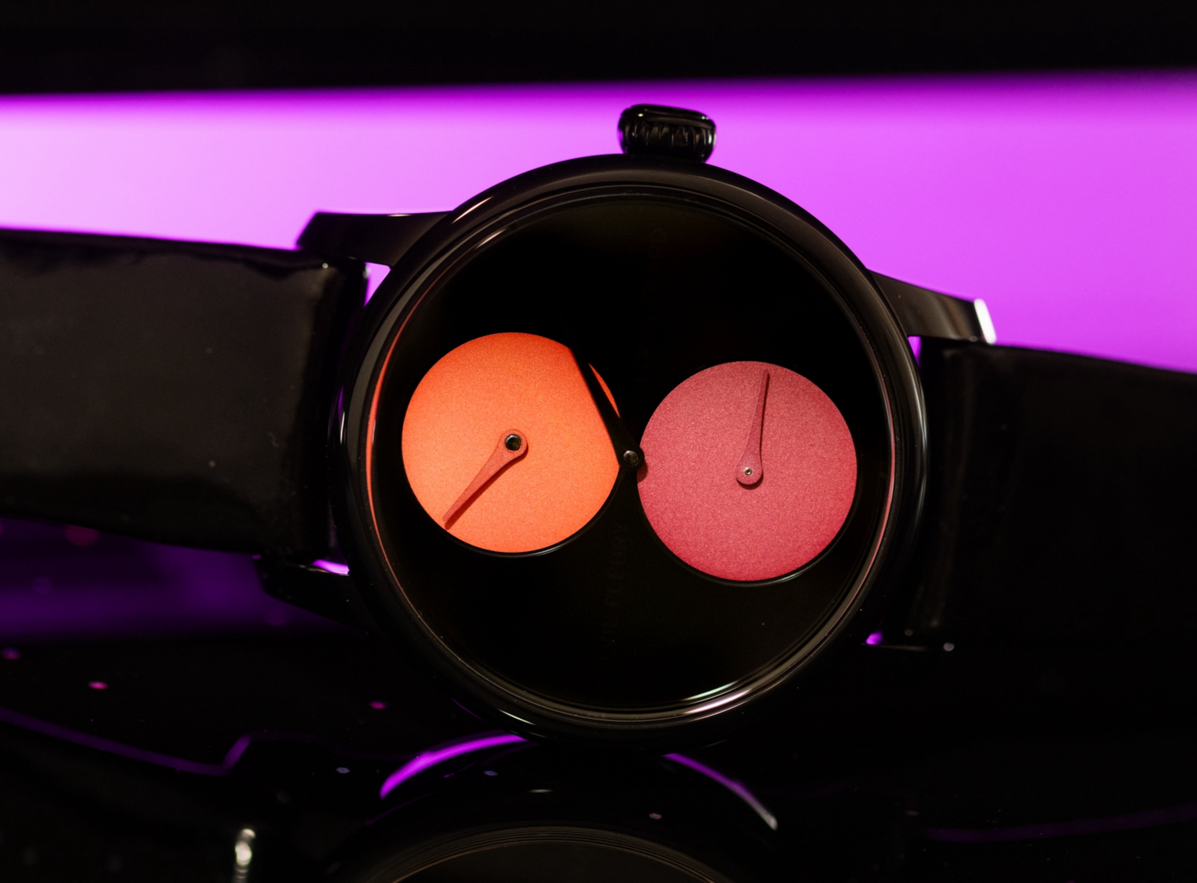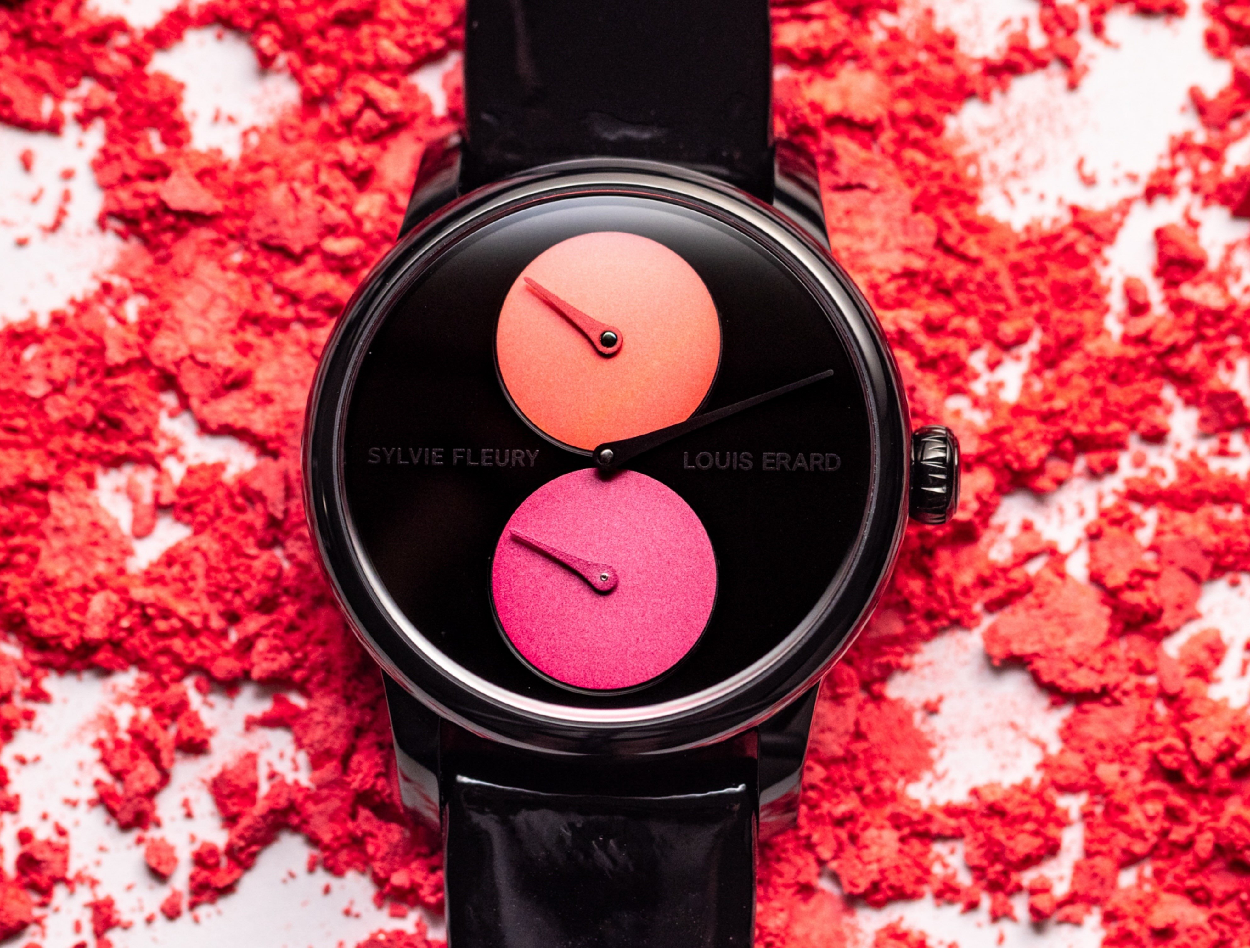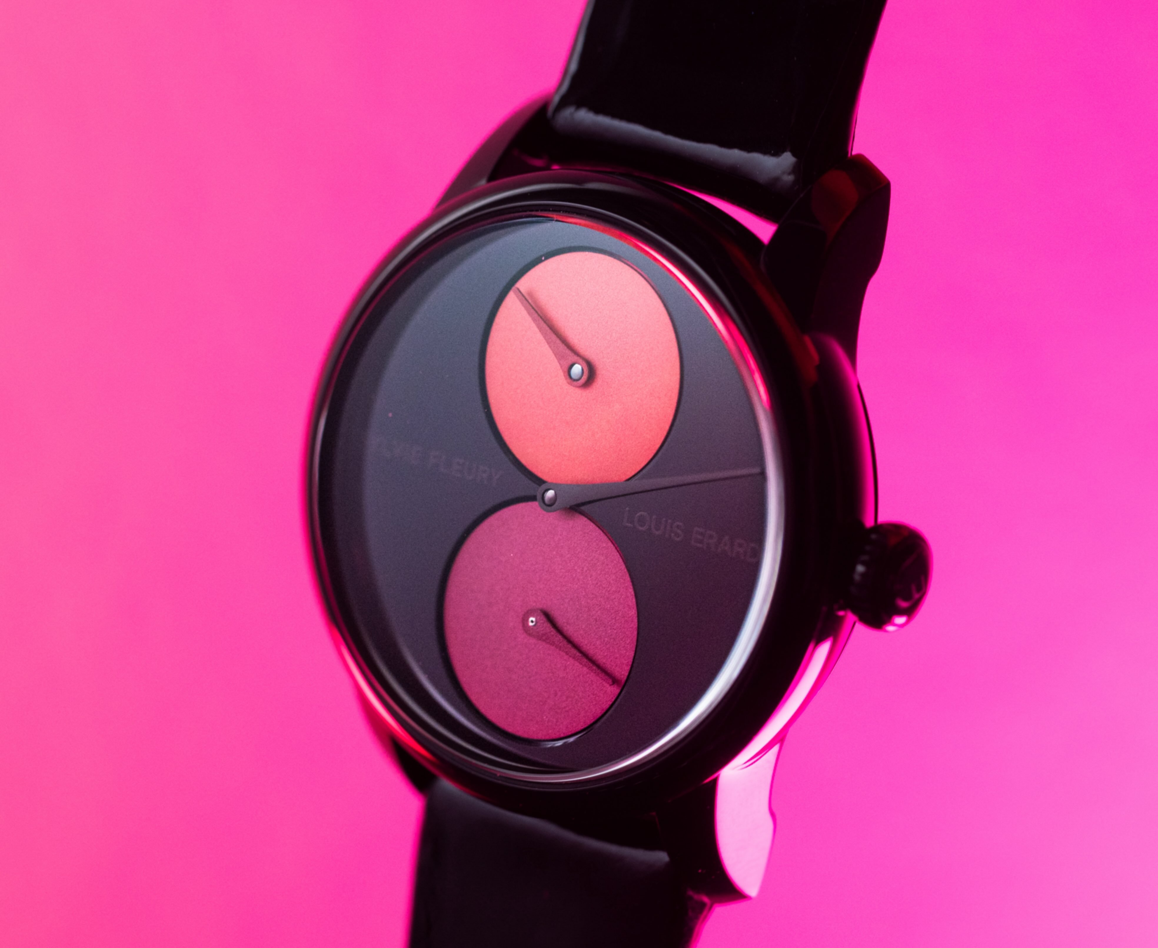沿襲Slyvie Fleury的風格,這枚全新的Le Régulateur x Slyvie Fleury Palette of Shadows腕錶就好像一個胭脂盤:39mm的黑色PVD不銹鋼錶殼中,以拋光黑色錶盤襯托兩個色澤鮮艷、特別造出粉狀質感的小盤——12時的小時盤為珊瑚色,6時的小秒盤為啞光玫紅色,其上的指針也以同色映襯。設於中軸的分針則為黑色,與兩根彩色指針組成品牌招牌的三針一線佈局。