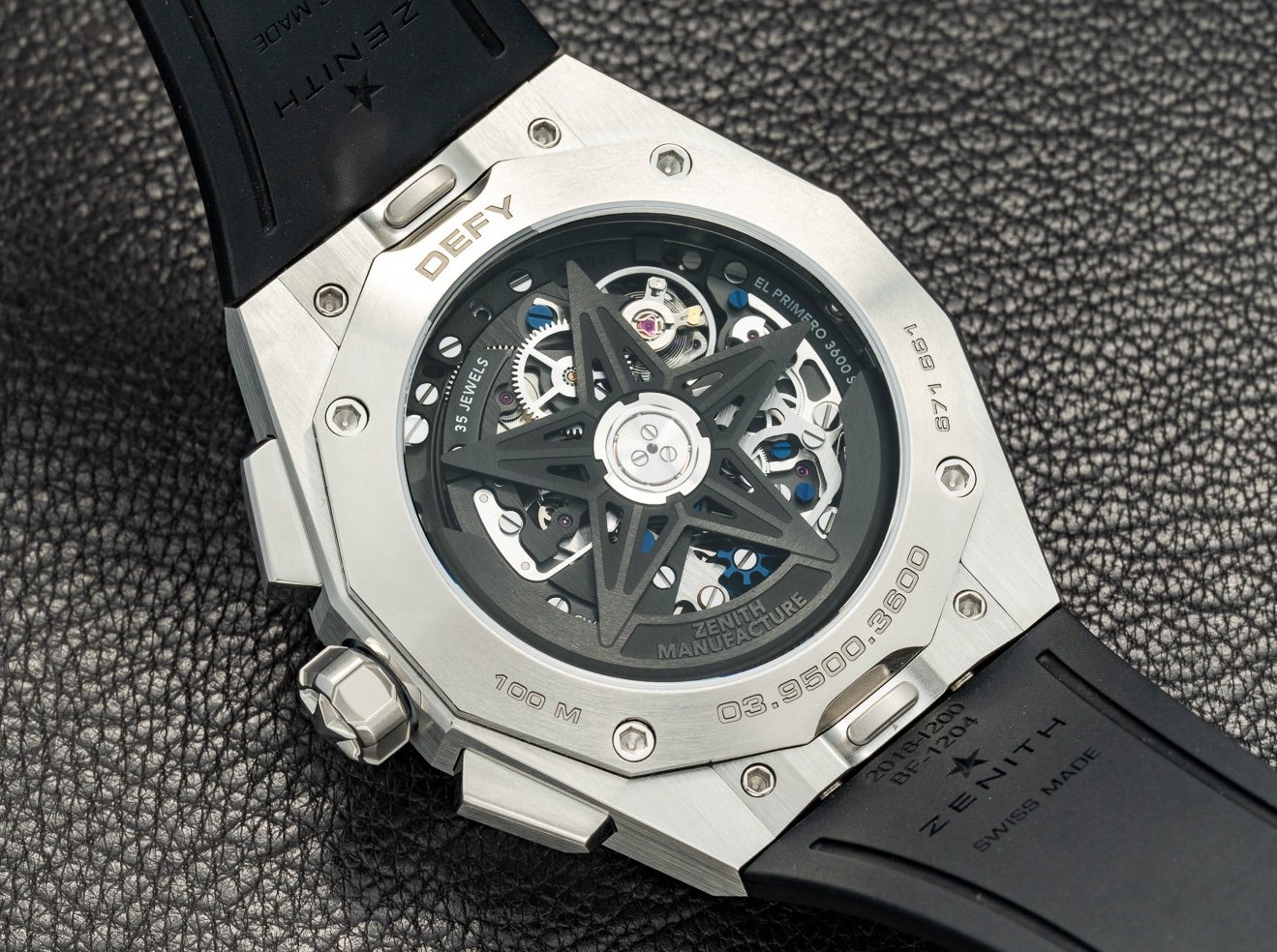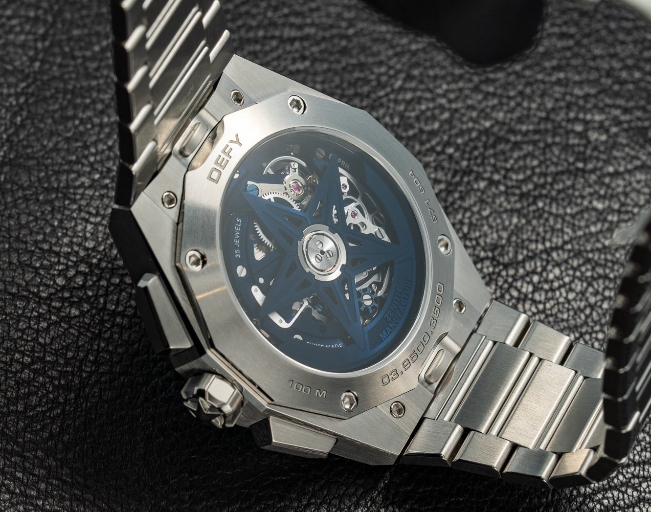 Defy Skyline Chronograph Skeleton初出道便有黑色和藍色兩種選擇,鏤空錶盤、主機板、錶橋和星形擺陀均以匹配的顏色呈現。