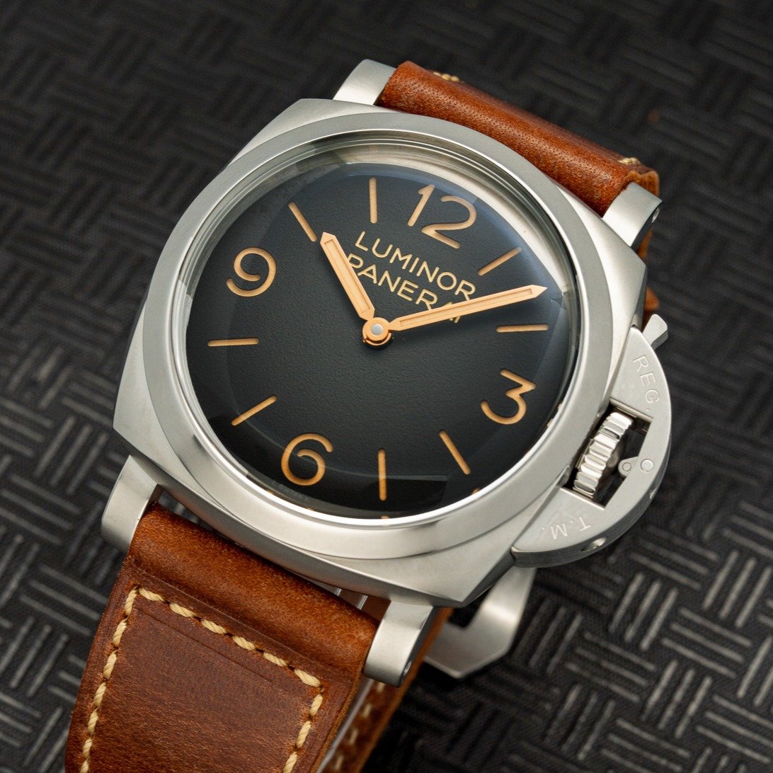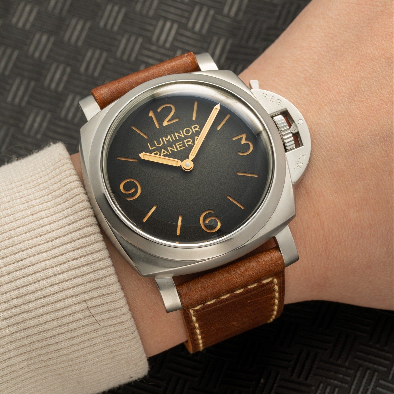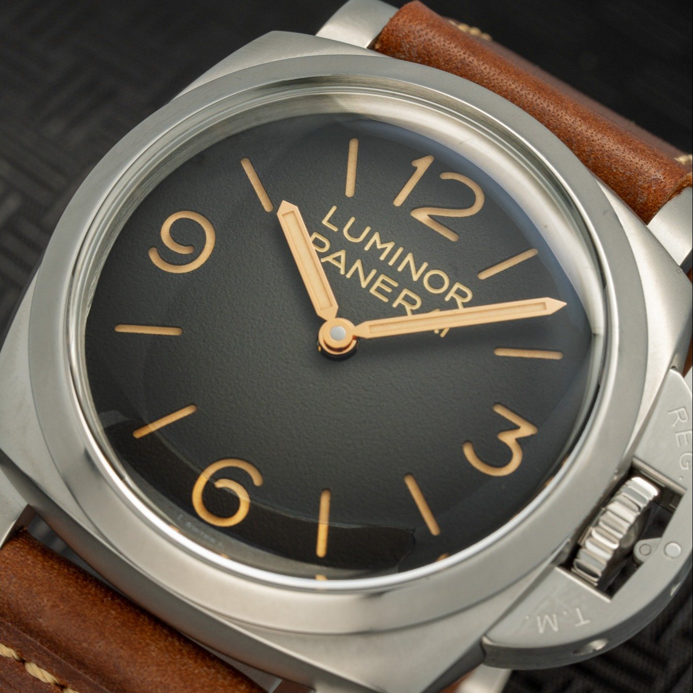 此外,錶鏡也從PAM372的壓克力改為堅硬耐刮的藍寶石水晶,錶盤則從純黑換成灰黑漸變的粒紋面,貫徹硬朗軍事風格。不變的是三文治錶盤結構,將上層的阿拉伯和棒形時標開孔,透出底下塗有米白色夜光物料的底層,時分兩針和品牌商標也以同色呼應,搭配採用撞色縫線的仿古小牛皮錶帶(隨錶附送黑色橡膠錶帶一條),整體配色很是復古。