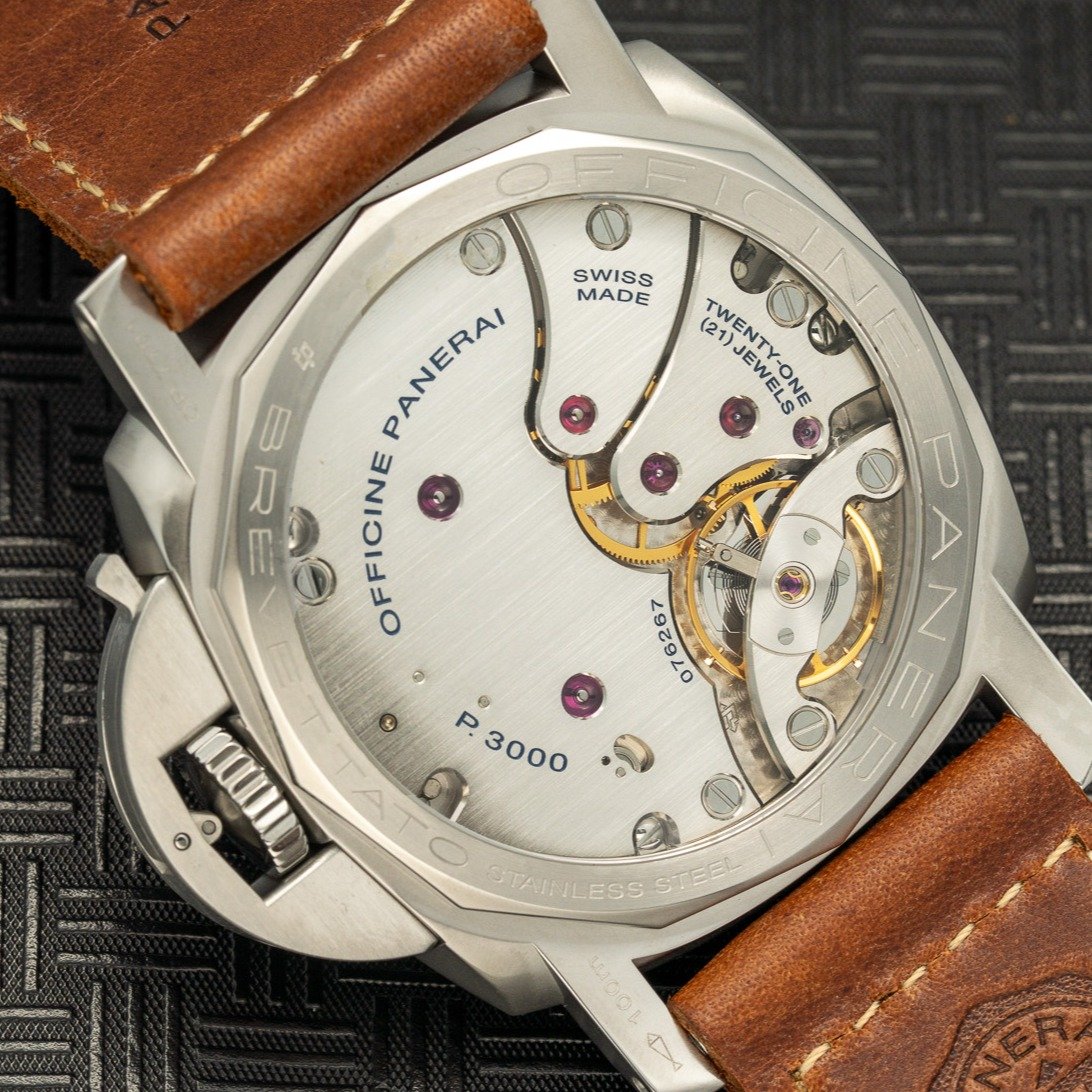 藍寶石底蓋下透視了P.3000三日鍊手動上鍊機芯的面貌,直徑達11.7mm的大型擺輪尤其矚目。其設計和結構也與品牌歷史相關,啟發自Panerai 60年代使用的舊機芯,包括顯示機械運作的開放式夾板、實而不華的修飾打磨,都彰顯了當年意大利海軍對腕錶的要求。