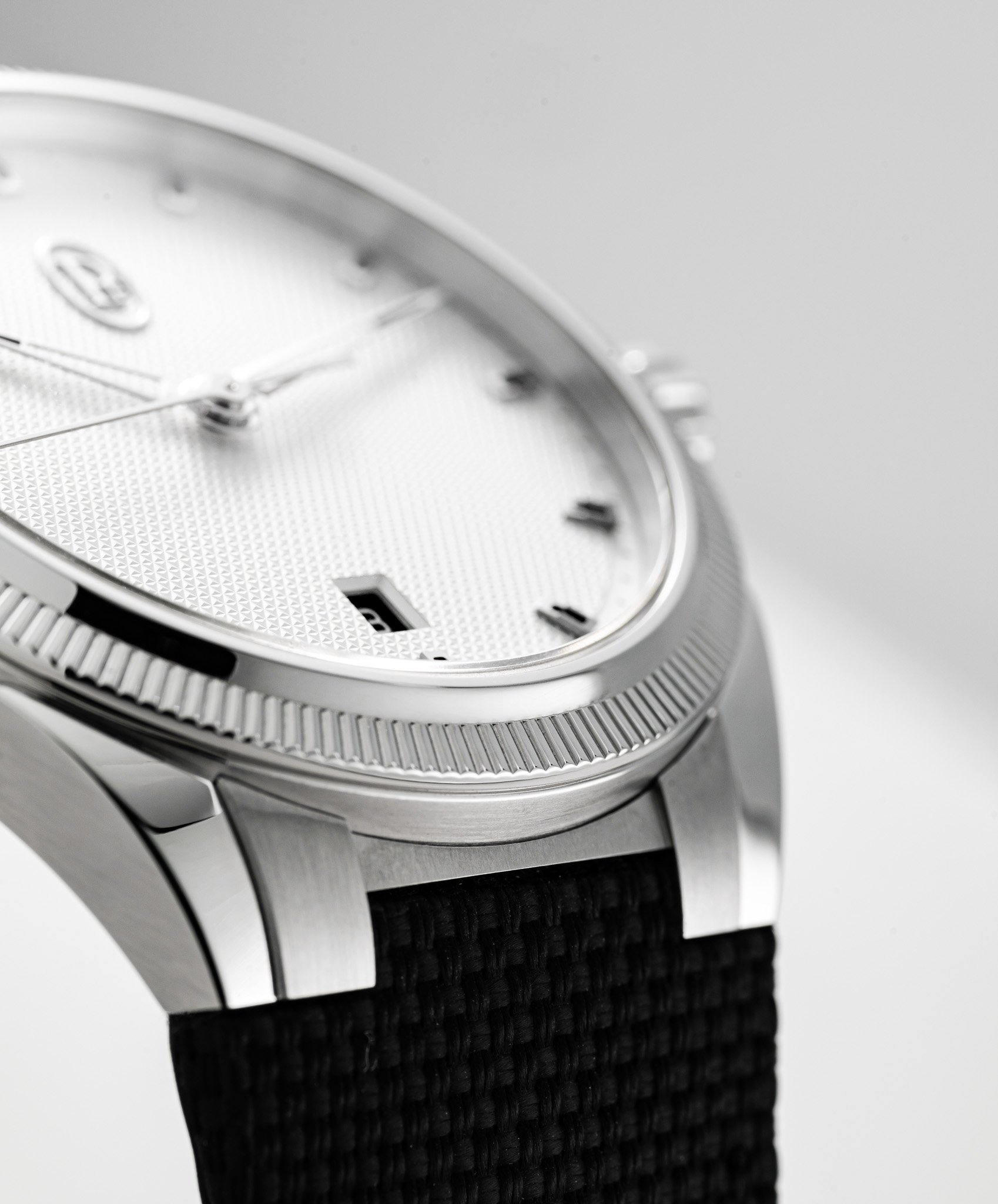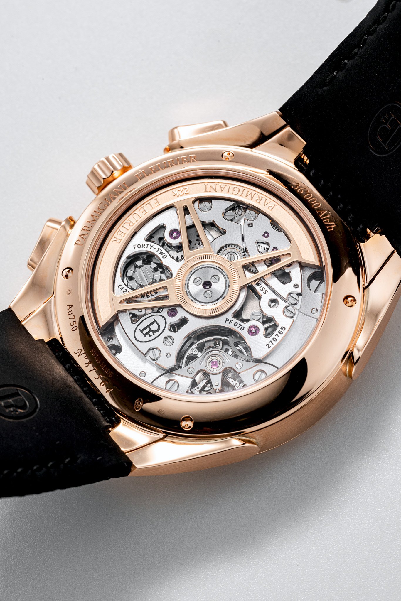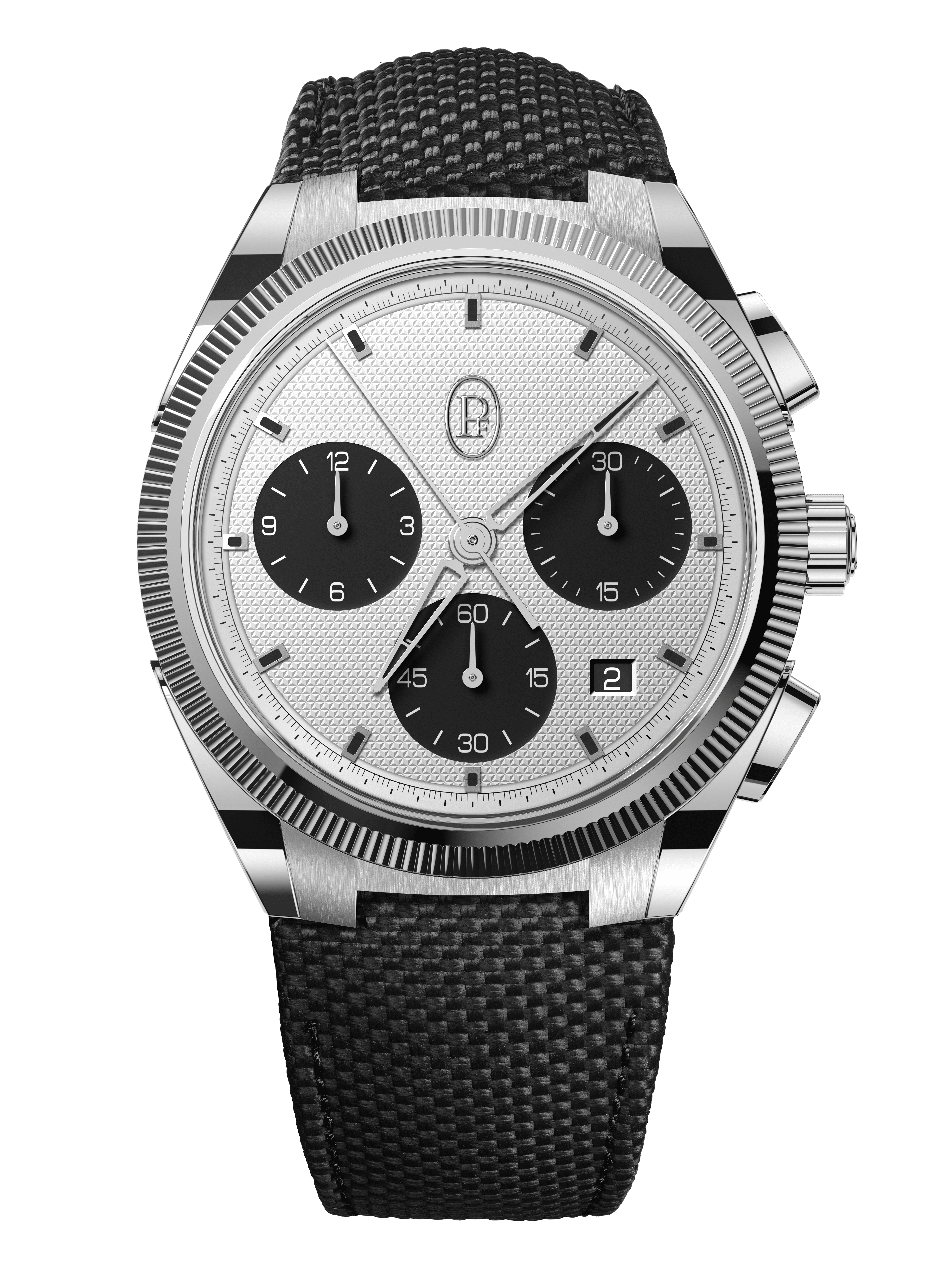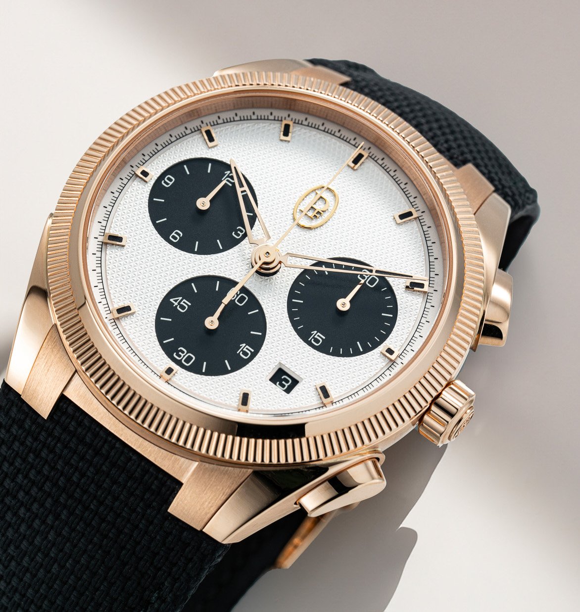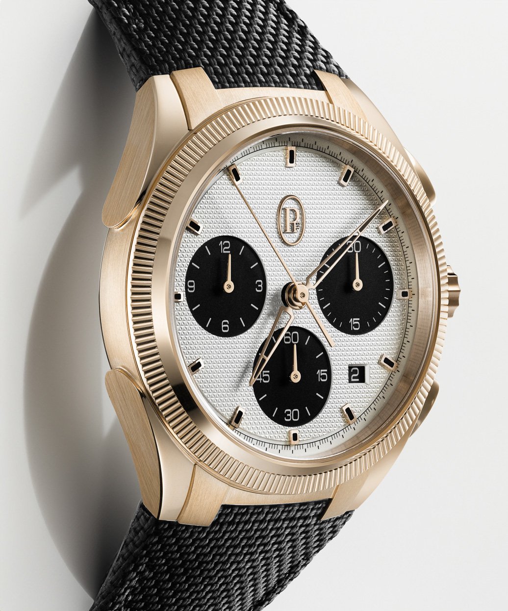 除了玫瑰金款,品牌也提供不銹鋼型號,這款「熊貓面」自然更親民。至於腕錶心臟,Tonda PF Sport Chronograph搭載PF070整合式計時機芯,在錶底可見導柱輪的運作,有垂直離合裝置,配備經鏤通的玫瑰金擺陀,提供65小時動力貯存,並以36,000高擺頻運作,獲COSC瑞士天文台認證;而100米的防水性能,已足夠大部分運動需要。作為luxury sports watch的重要配置,錶帶與錶殼跟Tonda PF一樣呈一體式設計,Tonda PF Sport今回「霸王卸甲」並非採用金屬鏈帶,而是配上極耐用的Cordura手工縫製橡膠錶帶,無論外觀質感和佩戴舒適度都比一般純橡膠錶帶更為優勝。每個細節都一絲不苟,自然亦是Parmigiani Fleurier的品牌作風。