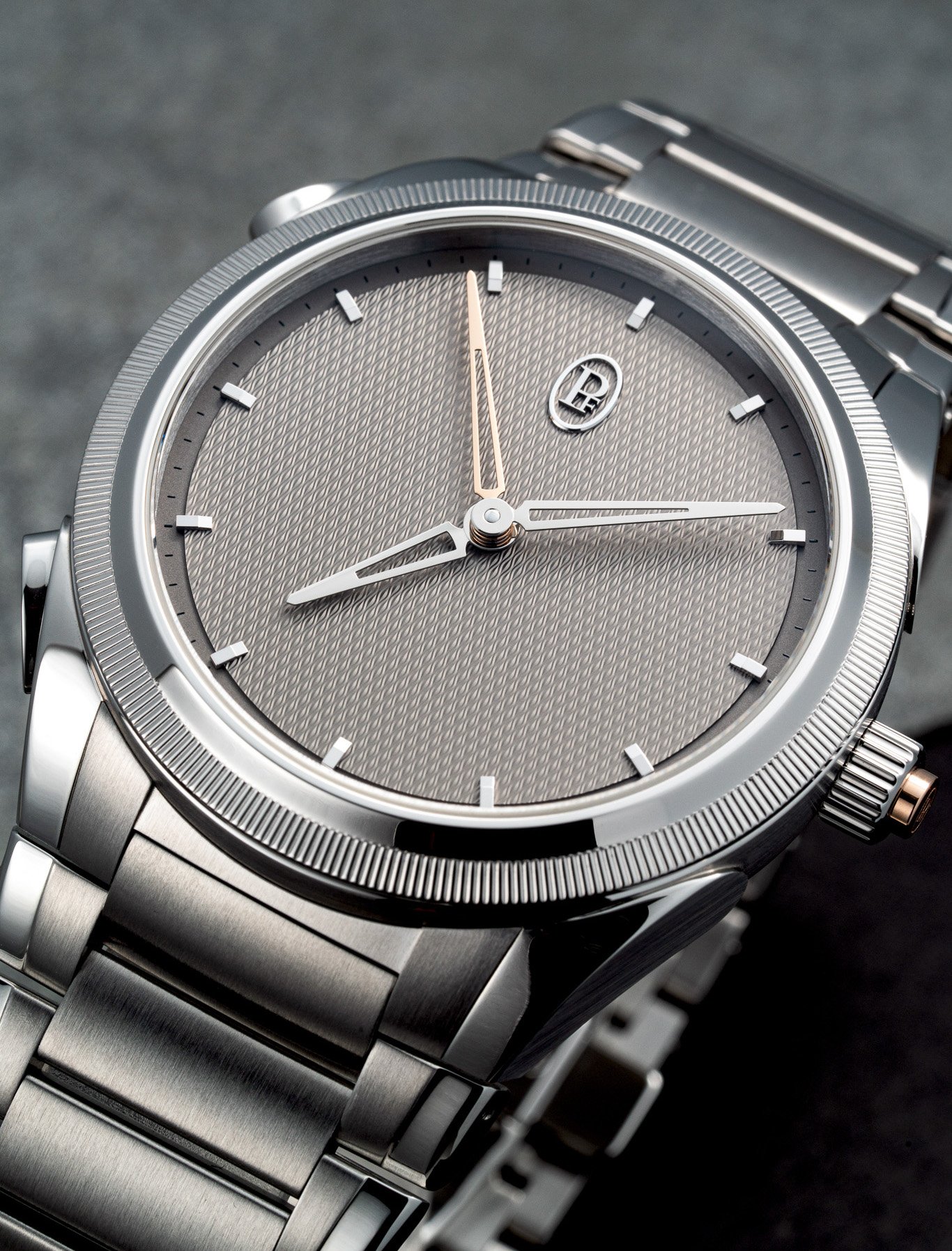 對腕錶稍有熟識的,都知一般潛水錶是透過轉動錶圈,並靠錶圈的刻度來倒數計時。這枚Tonda PF Minute Rattrapante在操作上完全顛覆這傳統,它首先保持Tonda PF系列的簡約設計,繼續有閃耀的鉑金錶圈,灰色的格狀大麥粒guilloché錶盤上只有“PF”品牌標誌、細小的時標、白金時分針和一支玫瑰金倒數支針。想啟動倒數計時的話,只需按下錶殼左邊的兩個按扭,分別以一分鐘及五分鐘為單位調校玫瑰金針,設定目標時間。當白金分針走到玫塊金針位置便代表倒數完畢。 如果不需計時,按一下錶冠上的按扭,玫瑰金針就會像計時錶的追針一樣飛返回原位,藏在白金分針之下,讓腕錶變回一枚純粹至簡的兩針錶。個人認為這倒數計時功能很有event reminder的意味,想像接下來一小時內突然有事情要處理,不需電話或紙筆,只要在腕錶簡單按幾下便設定好,操作與顯示都很生活化、人性化。腕錶低調創新地演繹複雜功能,也令人期望CEO Guido Terreni下回會如何突破飛返功能。