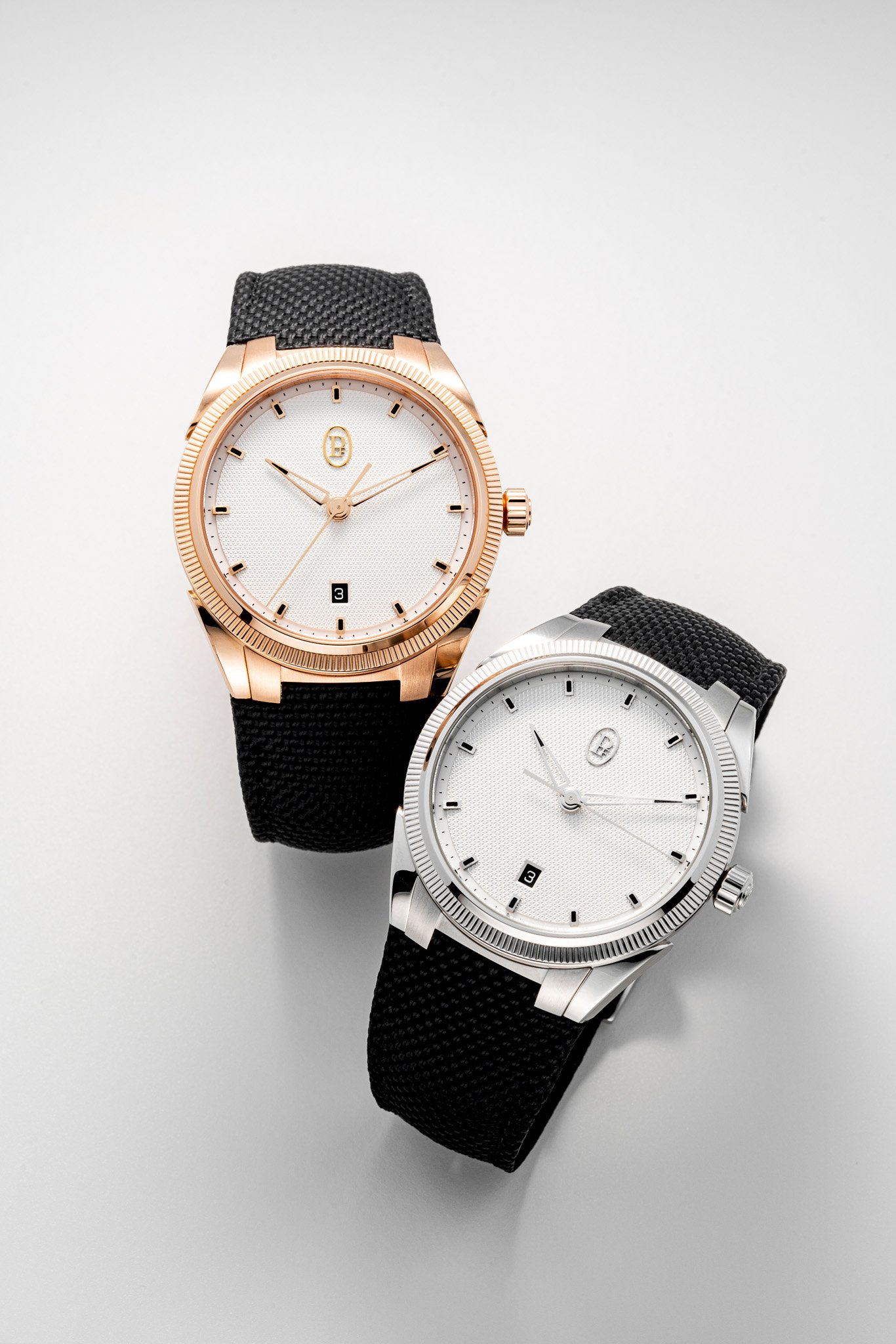 不過當然,Tonda PF Sport絕對有其獨特風貌,同樣是滾花錶圈,錶圈凹槽的數量在Tonda PF上是225個,排得又細又密,而在Tonda PF Sport則改為160個,凹槽距離較闊較粗,錶圈有更粗獷豪邁的運動感;更重要是,能營造出更突出的光影反射效果,令腕錶更有運動味道,尤其在玫瑰金錶款上可見一斑。銀白色錶盤綴有三角飾釘手工機刻,並巧秒地將三個啞黑色副盤放在充滿機刻飾紋的錶盤之上,在顏色及質感上營造鮮明對比,看起來不只悅目,亦有不俗的新鮮感。時分針的末端和細小的琢面小時刻度則覆有黑色夜光塗層,既可提升黑暗下的閱時清晰度,色調與計時小盤及黑底白字設計的日期視窗也更一致和諧。