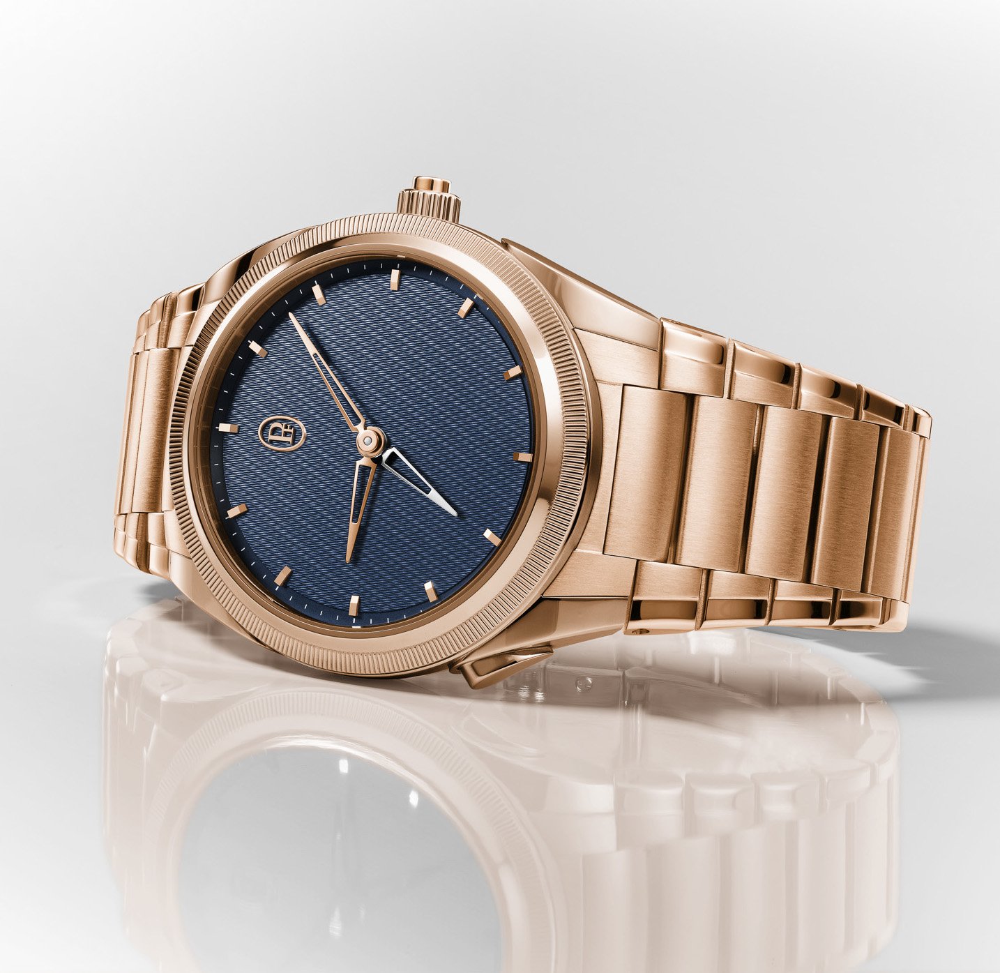 然後最初令大家眼界大開的Tonda PF GMT Rattrapante,就新加入全玫瑰金型號,為這枚不凡腕錶注入奢華感。不妨重溫這款全球首創、以追針方式顯示兩地時間的破格之作,腕錶獨到之處是配備兩支重疊的時針,分別以鍍銠黃金和玫瑰金製成,錶盤的時間顯示能按佩戴者錶所需而調整。只要按下八時位置的按鈕,上層負責顯示當地時間(local time)的玫瑰金時針便會向前跳動一小時;如此一來,便會顯露下方用作顯示居住地(home time)時間的鍍銠黃金指針。如果無需顯示第二時區,只要按下錶冠上的玫瑰金按鈕,玫瑰金時針便會飛返復位於鍍銠黃金時針之上,運作原理跟追針計時如出一轍。這精妙創新的追針兩地時間設計,能瞬間將一枚簡約的兩針錶轉換成GMT腕錶,不僅方便實用,再配合玫瑰金滾花錶圈及飾有格狀大麥粒guilloché圖案的藍色錶面,上手低調典雅,高貴悅目。