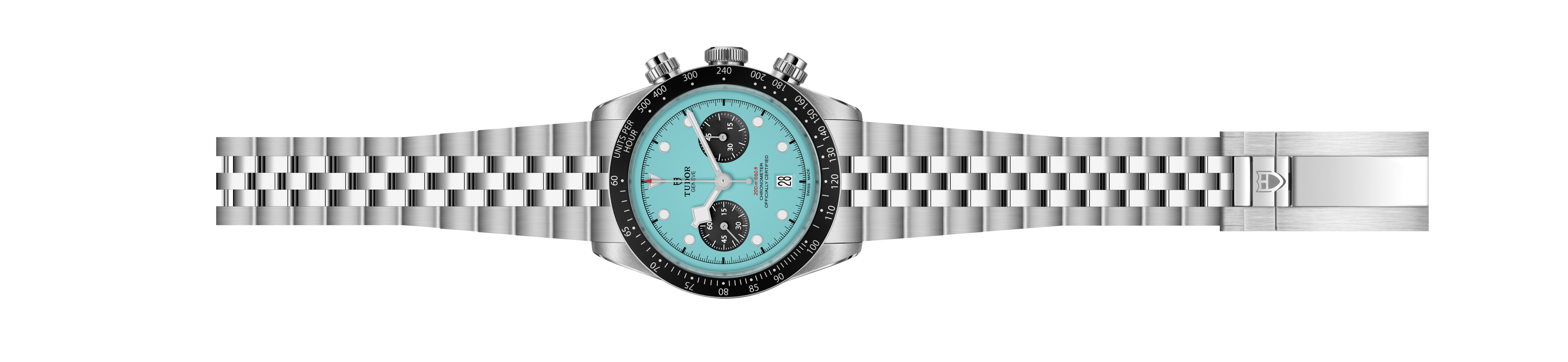 說回這枚新錶Tudor Black Bay Chrono Flamingo Blue,腕錶規格與Black Bay Chrono Pink或Bay Bay Chrono一樣,Panda Dial錶盤佈局配備45分鐘計時盤,6時位設有日曆窗,標誌性雪花指針塗上A級Super-LumiNova夜光塗層。
