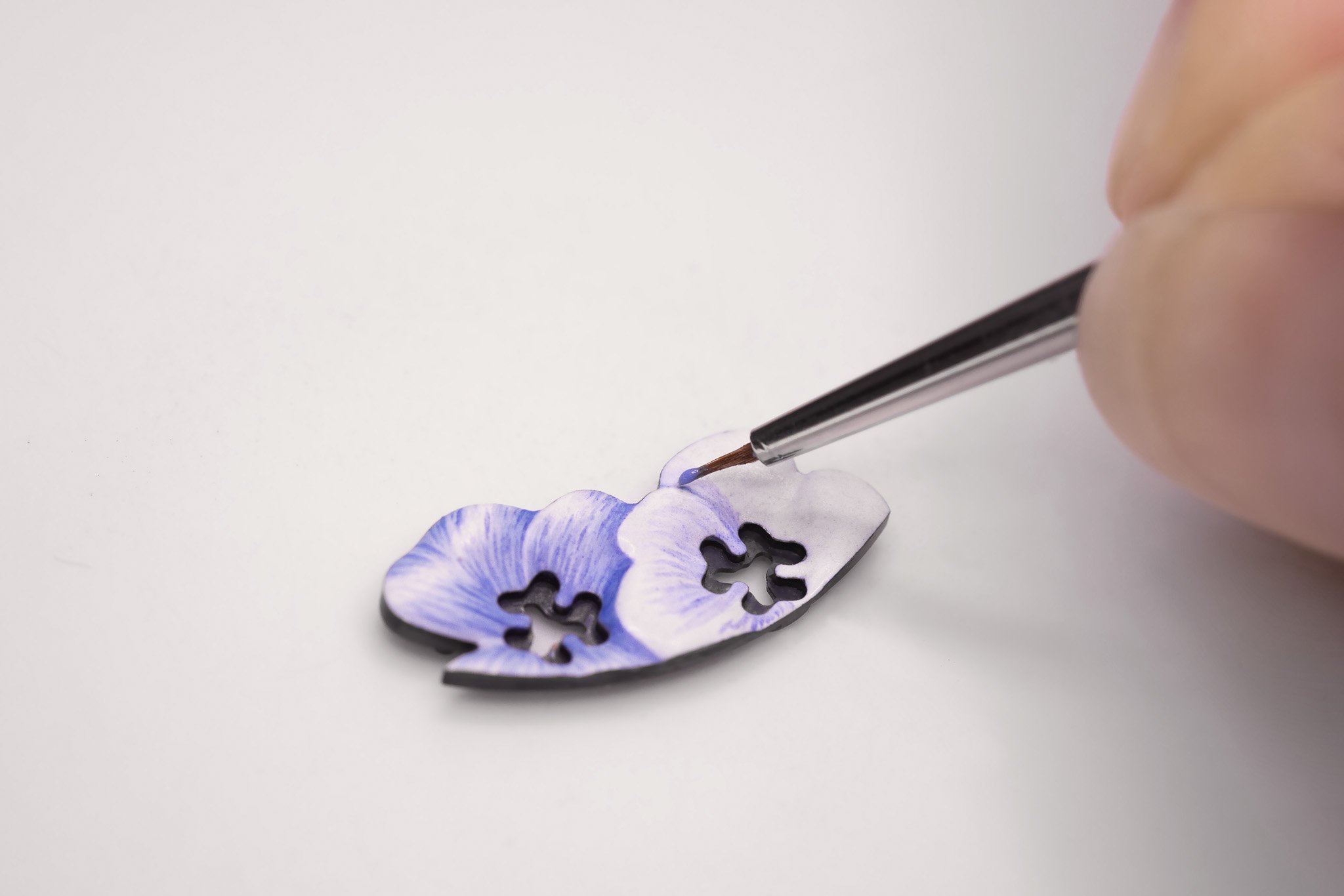 兩隻沿着弧形時標環飛舞的plique-à-jour彩繪玻璃琺瑯蝴蝶,交替顯示小時和刻鐘。只要按下設於錶殼左下方的按掣,即可驅動為時約9秒的動偶裝置:兩隻蝴蝶繞着錶盤飛舞一圈,三朵鮮花同時迎風輕柔搖曳,栩栩如生。