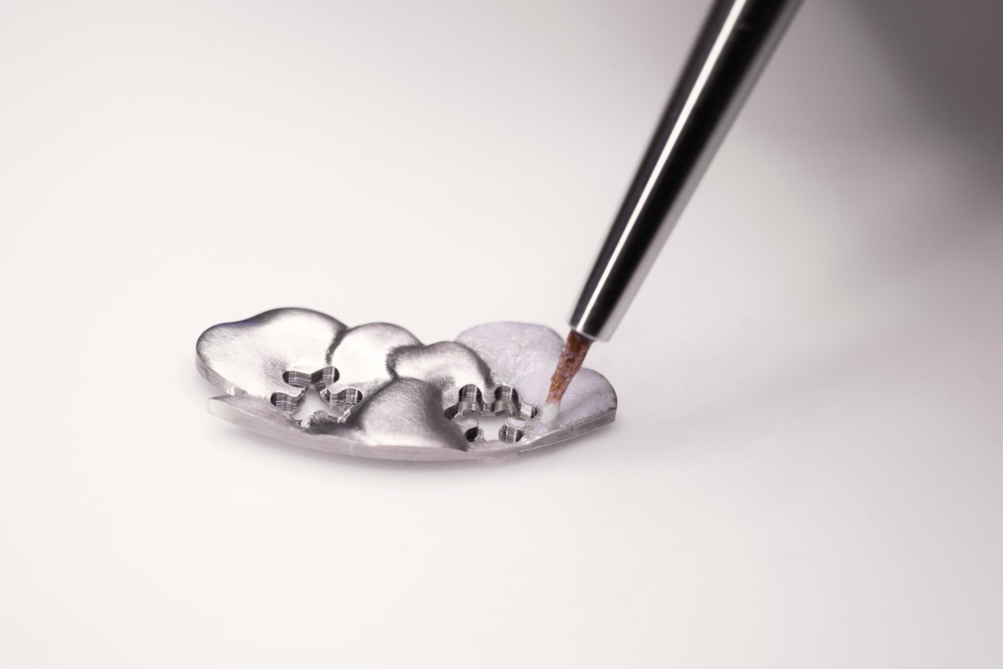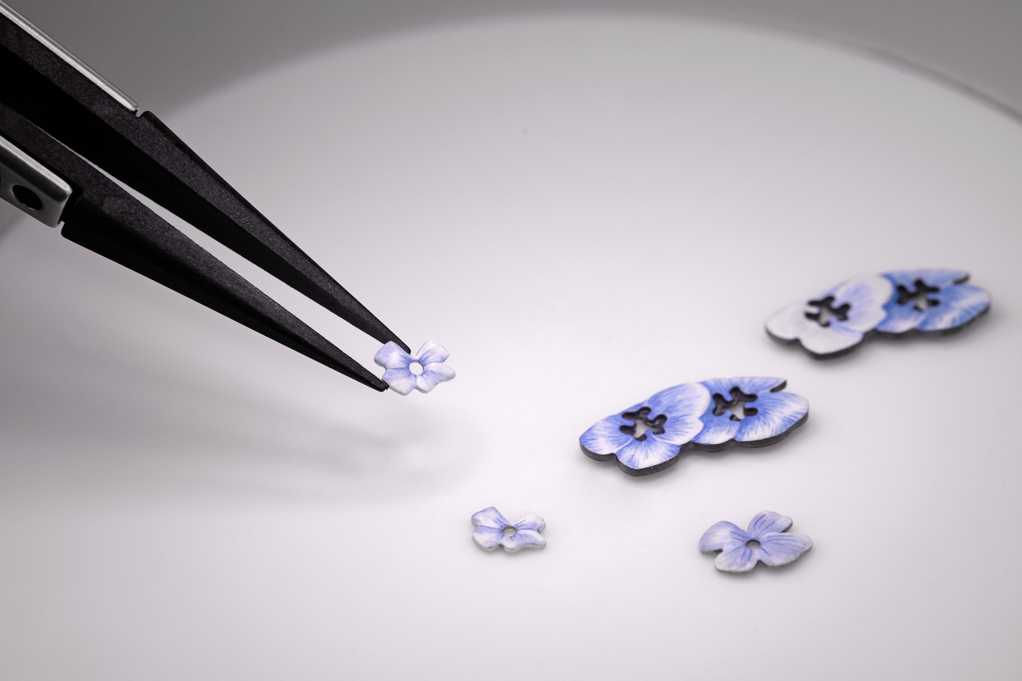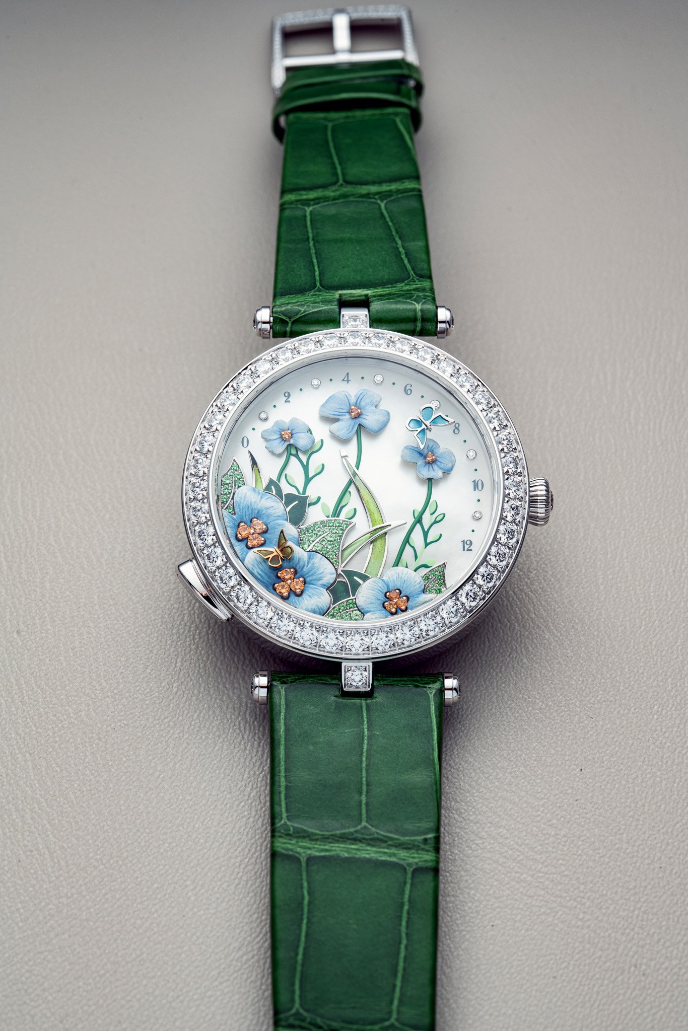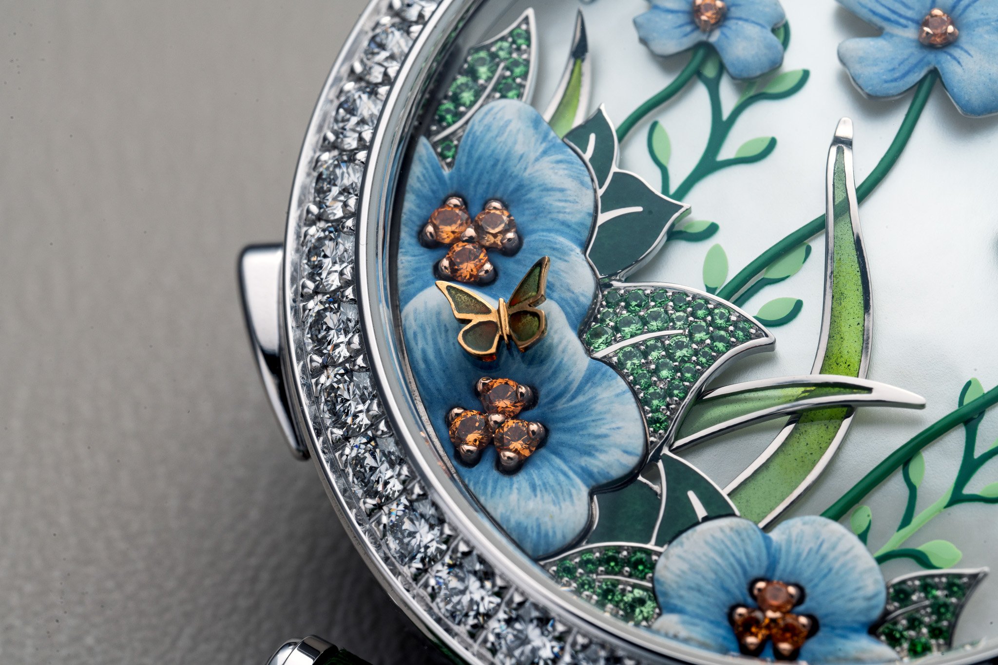 花園和大自然,多年來為世家帶來無窮創作靈感。Lady Arpels Brise d’Été腕錶也不例外,工坊大師以plique-à-jour彩繪玻璃琺瑯、內填琺瑯、微型彩繪、珍珠母貝和彩色寶石鑲嵌,在尺寸僅38mm的白金錶殼中建構立體花園的一隅,其中以琺瑯製成的花瓣,經工匠以幼細的貂毛筆人手繪畫上色,漸變細膩的天藍色彩繪大大增加了整個構圖的立體層次,加上錳鋁榴石花蕊、綠鈣鋁榴石葉片,及嫰綠的彩繪玻璃琺瑯野草,展現出詩意如畫的意境。